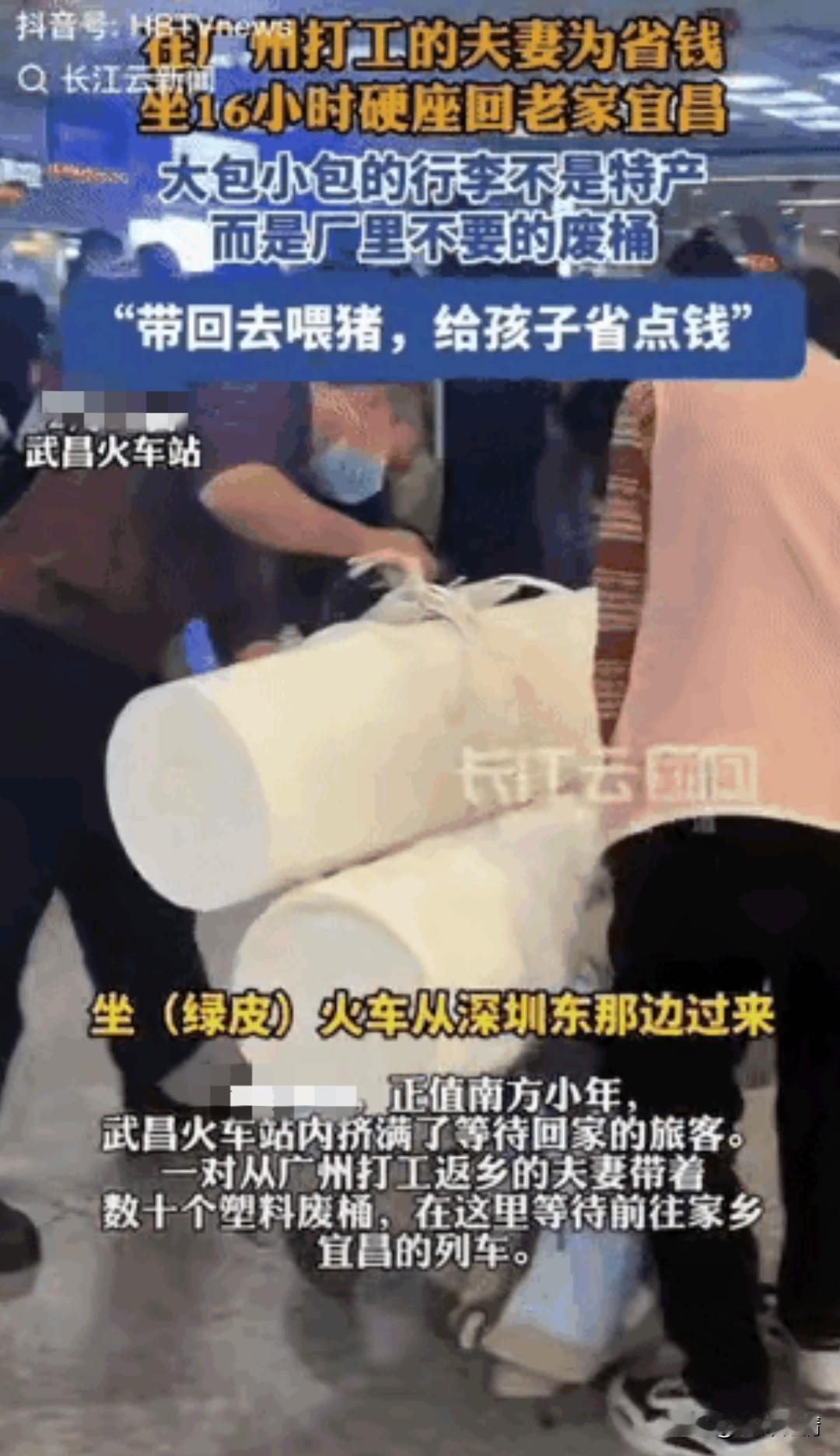 谁能想到回家过年带的不是礼品, 而是工厂不用的塑料桶, 夫妻双方从广东深圳而来, 带了非常多的塑料桶回家, 可以省四五百块钱, 这些桶让家里养猪比较方便, 这一幕在网络上引起了很多共鸣, 中国的父母都非常的热爱家庭, 他们就想省吃俭用, 为家庭贡献更多的力, 这也说明了底层人过得确实不是很好,要不然也不会带这么多塑料桶回老家,生活不易,且行且难, 不过大家努力还是有希望的, 希望老百姓的生活能够越过越幸福, 毕竟大过年的,安全到家才是第一位, 所以说绿皮火车坚决不能取消, 有钱人坐高铁,飞机, 老百姓坐绿皮火车, 每个人都有自己的选择, 不能让所有的人都去坐高铁, 因为不是所有的人收入都那么高, 贫富收入差距正在加大, 相信以后会缩小这个差距, 毕竟大家都在为这个目标而努力! 过年 铁路列车 绿皮火车为什么受欢迎? 绿皮火车为何仍然深受欢迎?