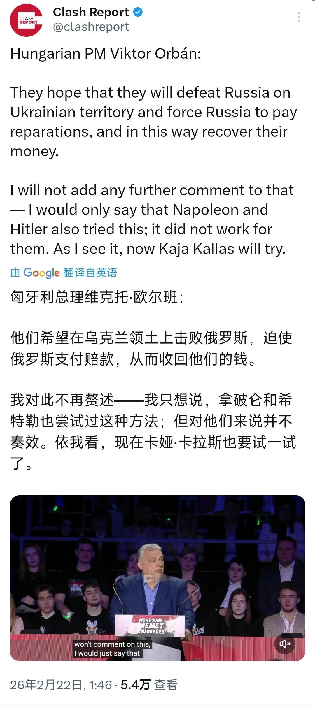 匈牙利总理欧尔班今天(2月22日)表示:“他们希望在乌克兰领土上击败俄罗斯,迫使俄罗斯支付赔款,从而收回他们的钱。我对此不再赘述——我只想说,拿破仑和希特勃也尝试过这种方法,但对他们来说并不奏效。依我看,现在的卡娅.卡拉斯也要试一试了。” 欧盟内部对于援乌问题出现重大分歧,昨天匈牙利一票否决了欧盟向乌克兰贷款900亿欧元的计划,此前法国、意大利、西班牙、斯洛伐克等国反对欧盟提出武装采购计划,而致900亿欧元的贷款计划久拖不决,其真正目的都不愿意承担此笔贷款给各国带来的风险。尽管卡拉斯主张俄乌冲突继续,但她的号召力可以忽略不计,冯德莱恩称其为“孤独的独裁者”,鲁比奥见她绕着走,法国、意大利及德国领导人近日均发声愿意与俄罗斯展开对话。