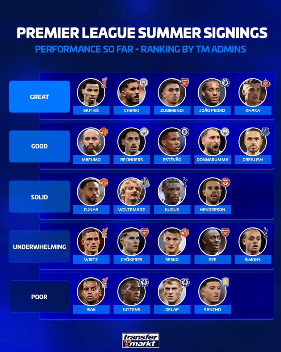 虎扑02月22日讯德国转会市场盘点了英超联赛在去年夏窗的一些重要引援,并分别进行评级: