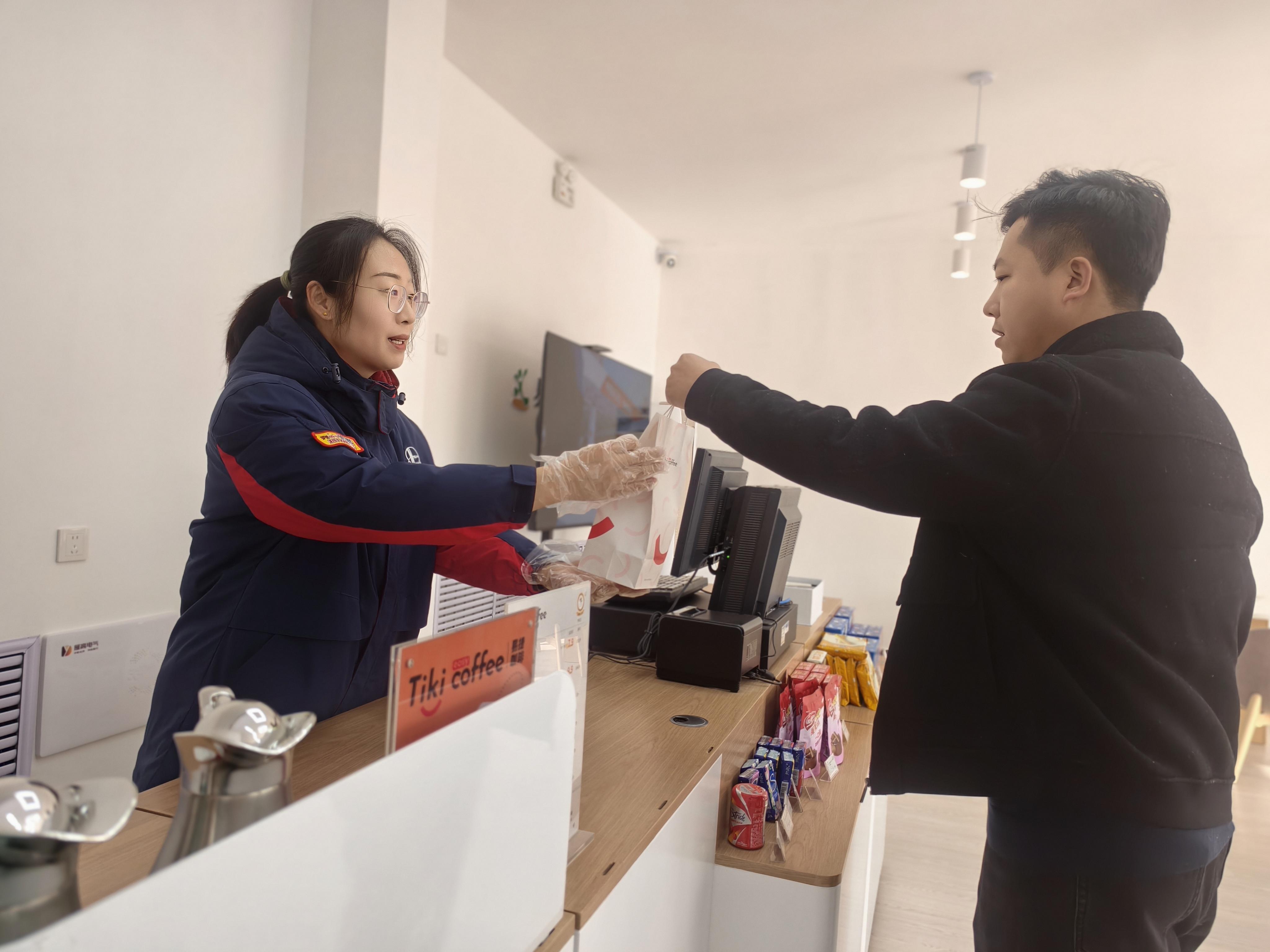 中午时分,客流稍缓,王晨晨才得以到客户服务中心稍作休息,可刚坐下没多久,就有顾客推门来点咖啡。她立刻起身洗手、戴上一次性手套,熟练地为顾客制作咖啡,用一杯温热的咖啡,温暖着旅客的返程路。