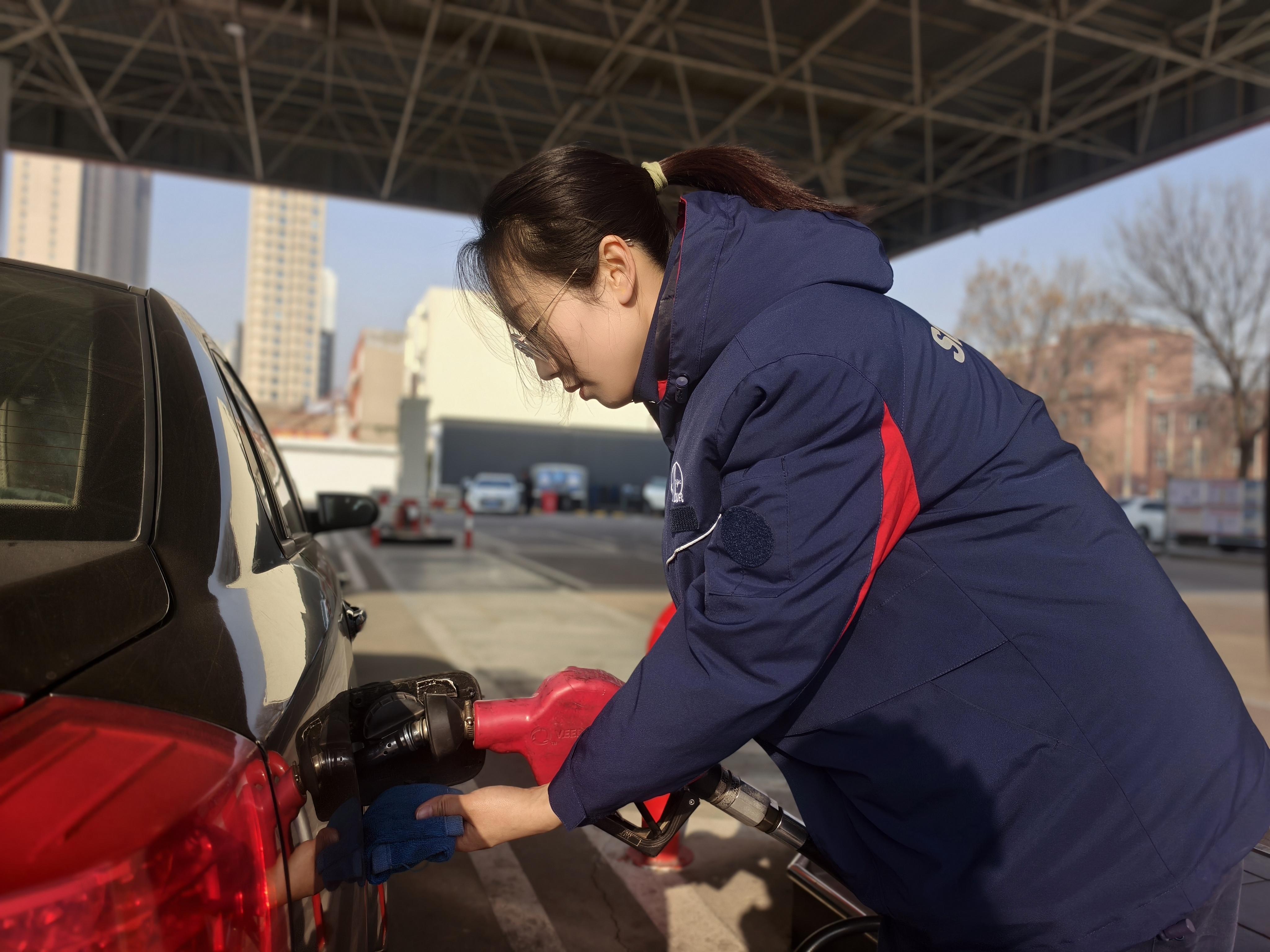 上午9时,加能站的车流渐渐密集,加油区迎来了忙碌时刻。王晨晨立刻投身加油一线,引车、提枪、加油,一系列动作娴熟利落、一气呵成。“过年好,一路平安!”每为一位顾客加完油,她都会送上一句暖心的祝福。