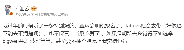 哦过年的时候听了一条特别爆的,亚运会明凯报名了,tabe不愿意去带(好像也不能去不清楚啊),也不保真,当瓜吃算了,如果是明凯去我觉得不如选举bigwei井盖波比等等。甚至要不抽个弹幕上我觉得也行。