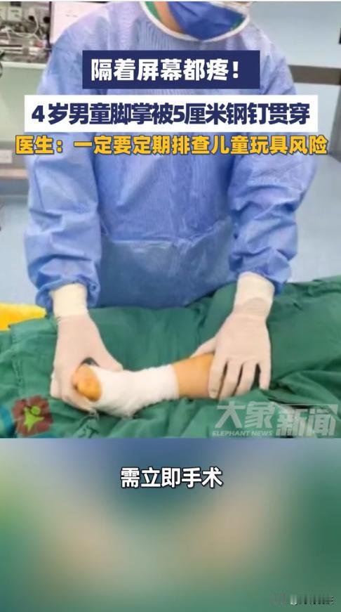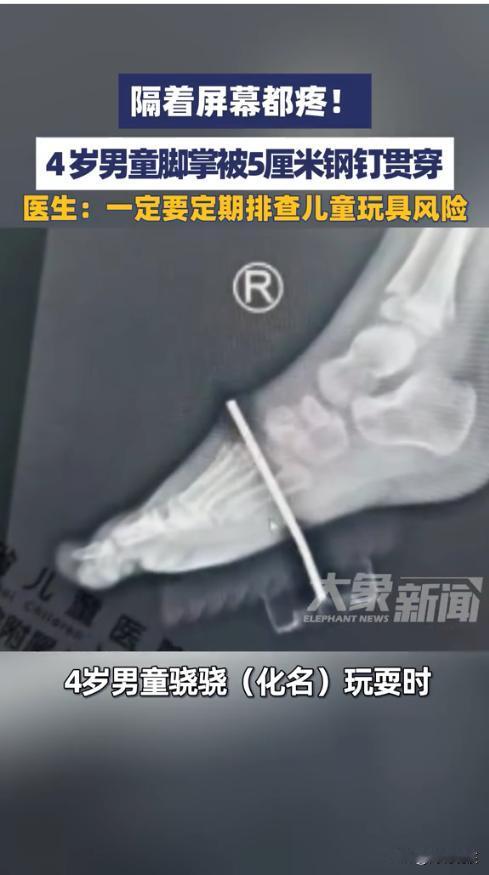 “悲剧还是发生了!”近日,江西,一4岁男孩在玩耍时,脚掌一下被一根5厘米长的钢钉狠狠刺穿,钢钉从脚底直接贯穿至脚背。男孩瞬间痛的哇哇大哭,家人紧急送医后,X光片里清晰可见钢钉横亘在稚嫩的骨骼间,画面令人揪心,网友:隔着屏幕都觉得疼! 孩子天性活泼好动,日常玩耍时总会接触各类玩具与物品,家长往往容易忽视潜藏的风险。像这种外露的钢钉、尖锐部件,一旦被孩子误触,就可能造成严重伤害。 据媒体1月31日报道,骁骁当时正在摆弄家里的玩具,不曾想一根钢钉竟从玩具里掉了出来,骁骁没有注意一下踩在了钢钉上,瞬间的剧痛让他当场大哭,家人赶紧上前查看,这才发现一根大钢钉牢牢扎在了骁骁脚掌里。 紧急送医后,医生立即为骁骁进行了手术,顺利取出钢钉。检查还发现钢钉已穿透足底筋膜与骨骼,若处理不及时,可能引发感染、骨折甚至神经损伤,留下行走功能障碍等后遗症。 医生提醒,这类儿童外伤很多都因为玩具或周边杂物的安全隐患未被及时排查造成的。长时间使用的玩具很可能出现部件脱落、尖锐外露等问题,所以家长一定要定期排查孩子的玩具及周边环境风险,别让“小疏忽”酿成“大伤害”。 网友表示,确定是玩具里的吗。可是小孩子的玩具里不应该会有这么长的钢钉,还是要仔细检查一下家里其他地方,防患于未然。 信息来源:《隔着屏幕都疼!4岁男童脚掌被5厘米钢钉贯穿,医生:一定要定期排查儿童玩具风险