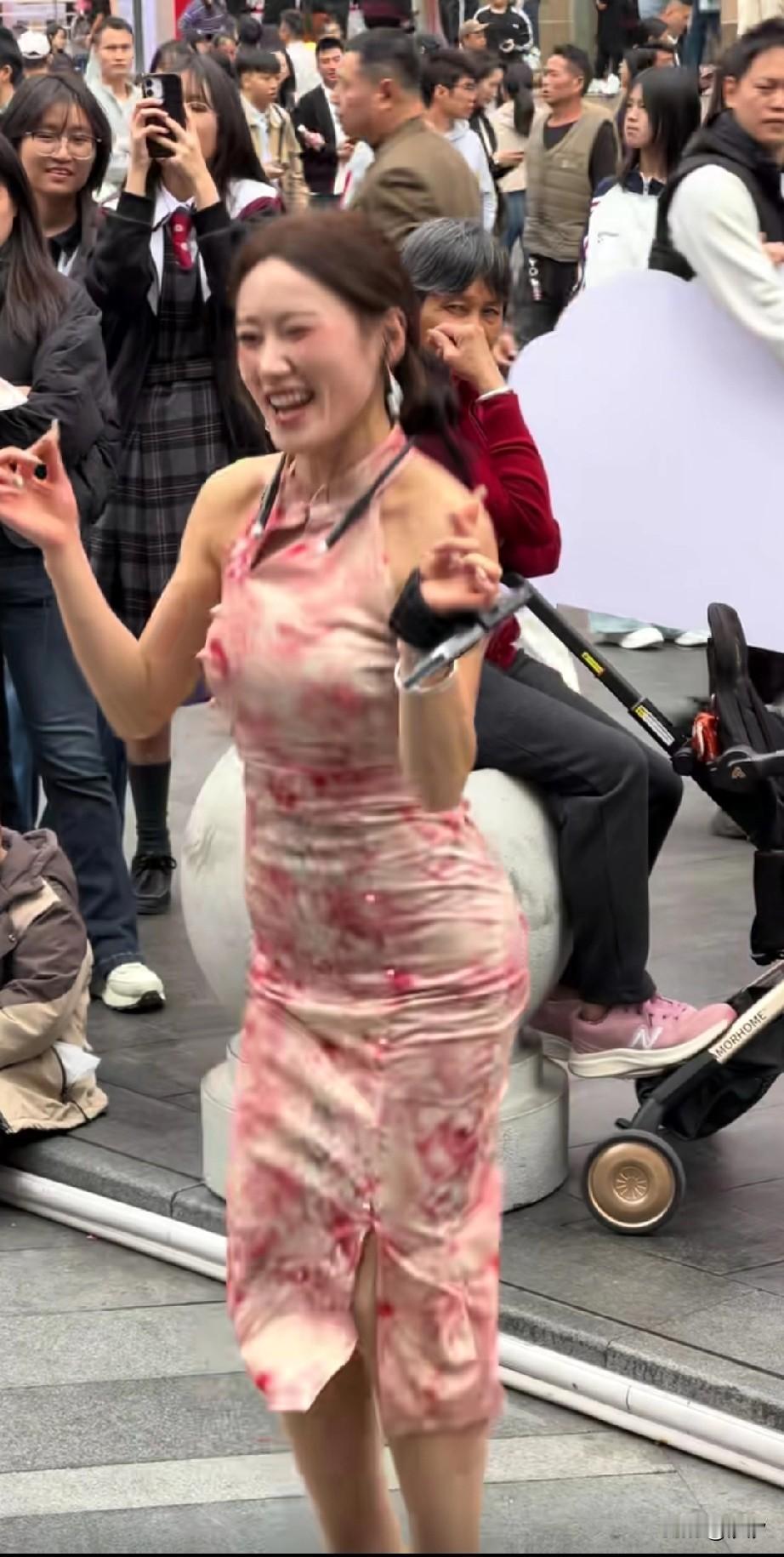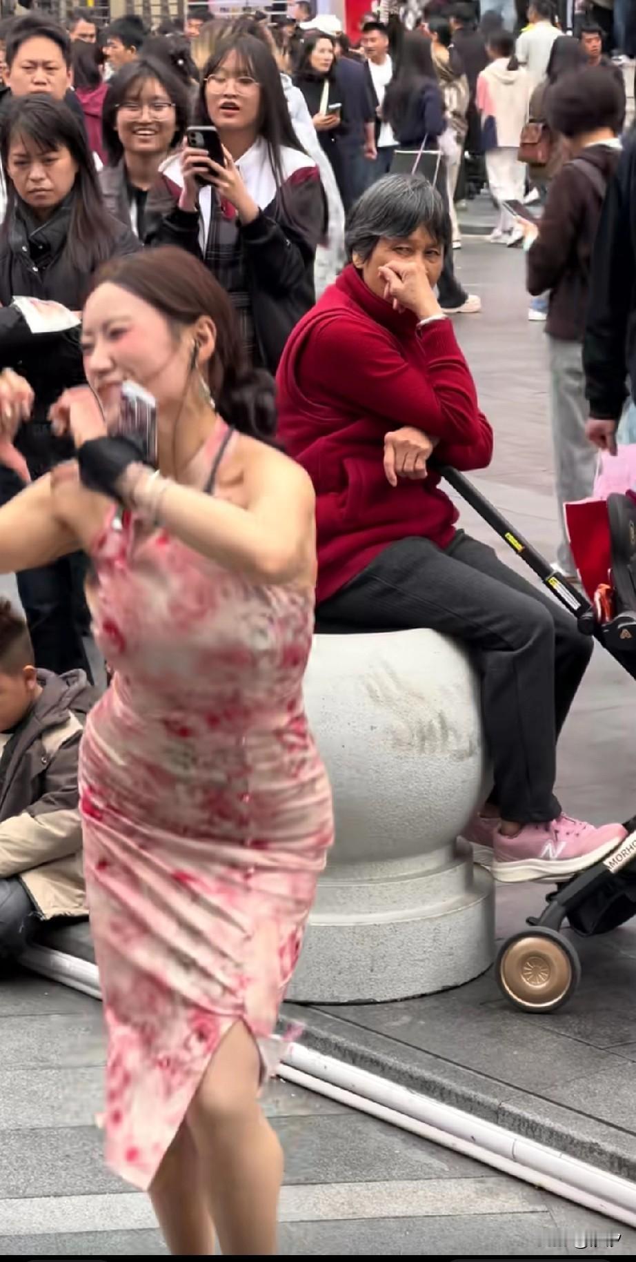 现在的网红脸皮都很厚, 大家在闹市街去逛街, 旁边有一个女网红, 穿着旗袍, 在那里跳着热舞, 旁边的女人看到她这个样子, 有的露出了一脸不屑, 有的又是满脸羡慕, 旁边的大爷看的直流哈喇子, 不过看这位老阿姨, 年龄也不小了, 就是脸上的粉底比较厚, 一笑这边很多褶皱纹, 不愧是敢在网上露面的人, 特效一点也不能少, 不然直播间的榜一大哥就要逃跑了, 从路人的视角来看, 长得虽然不好看, 身材还是不错的, 只不过在人来人往的闹市区, 这样跳舞不合适吧! 大家对于现在这样的网红怎么看?