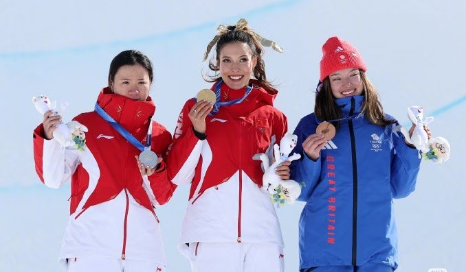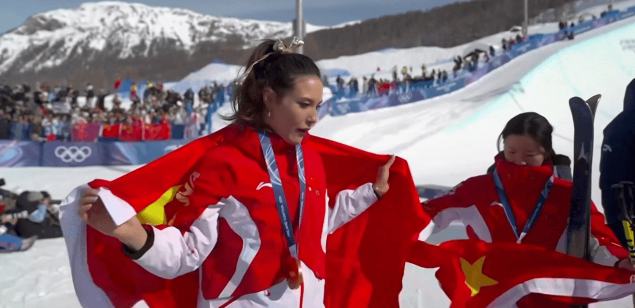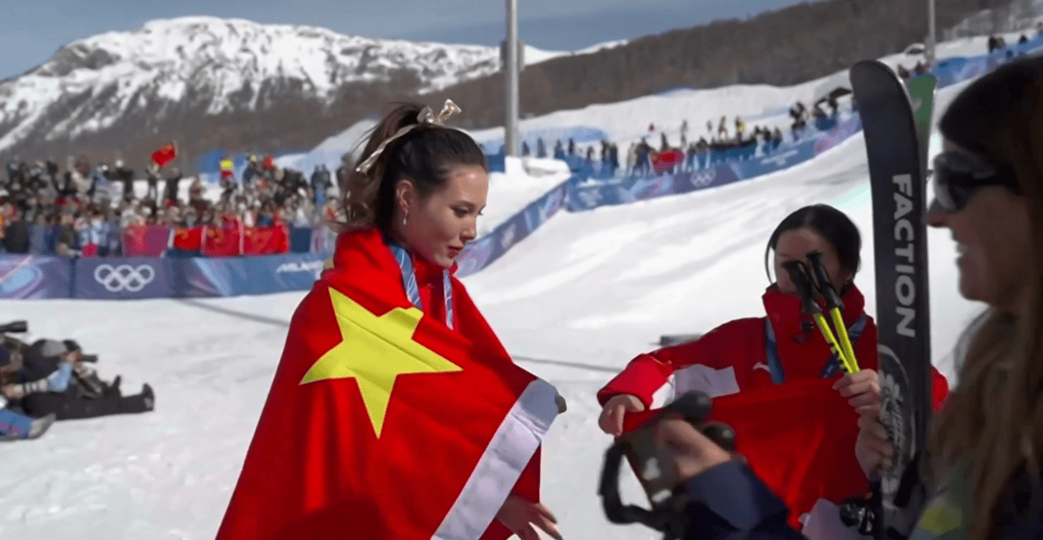 之后,谷爱凌又和李方慧一起身披五星红旗庆祝。