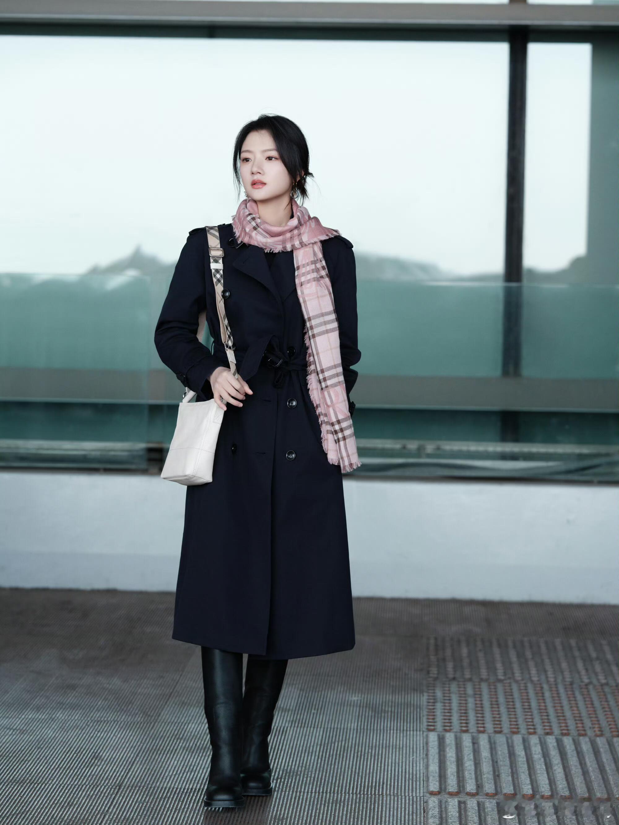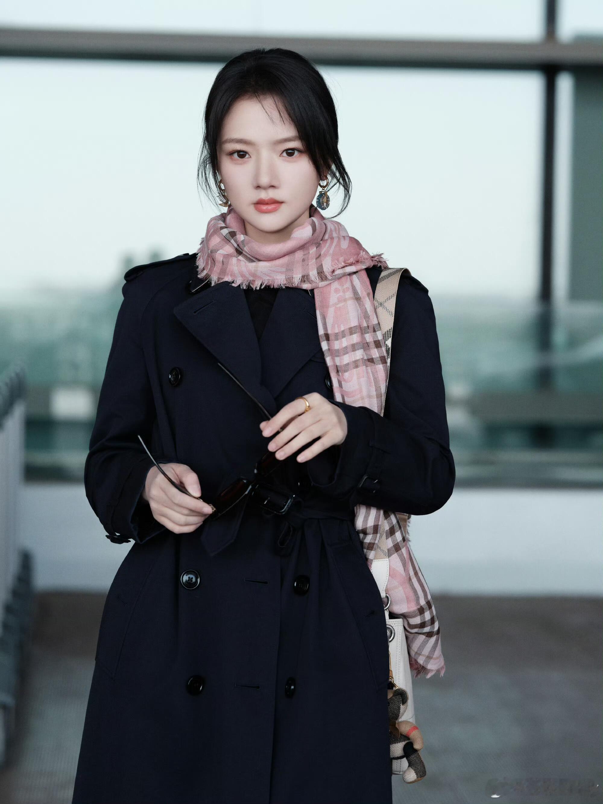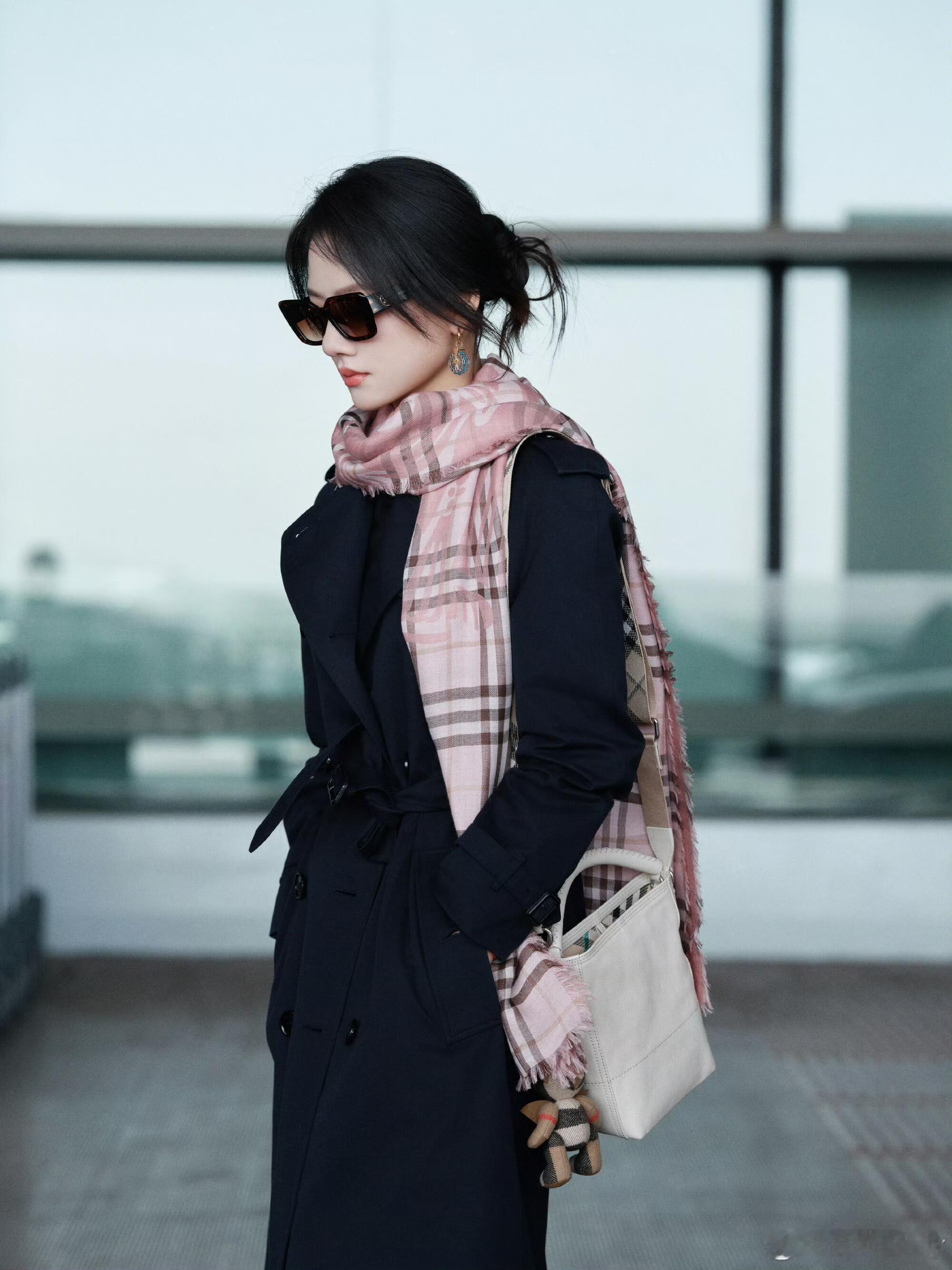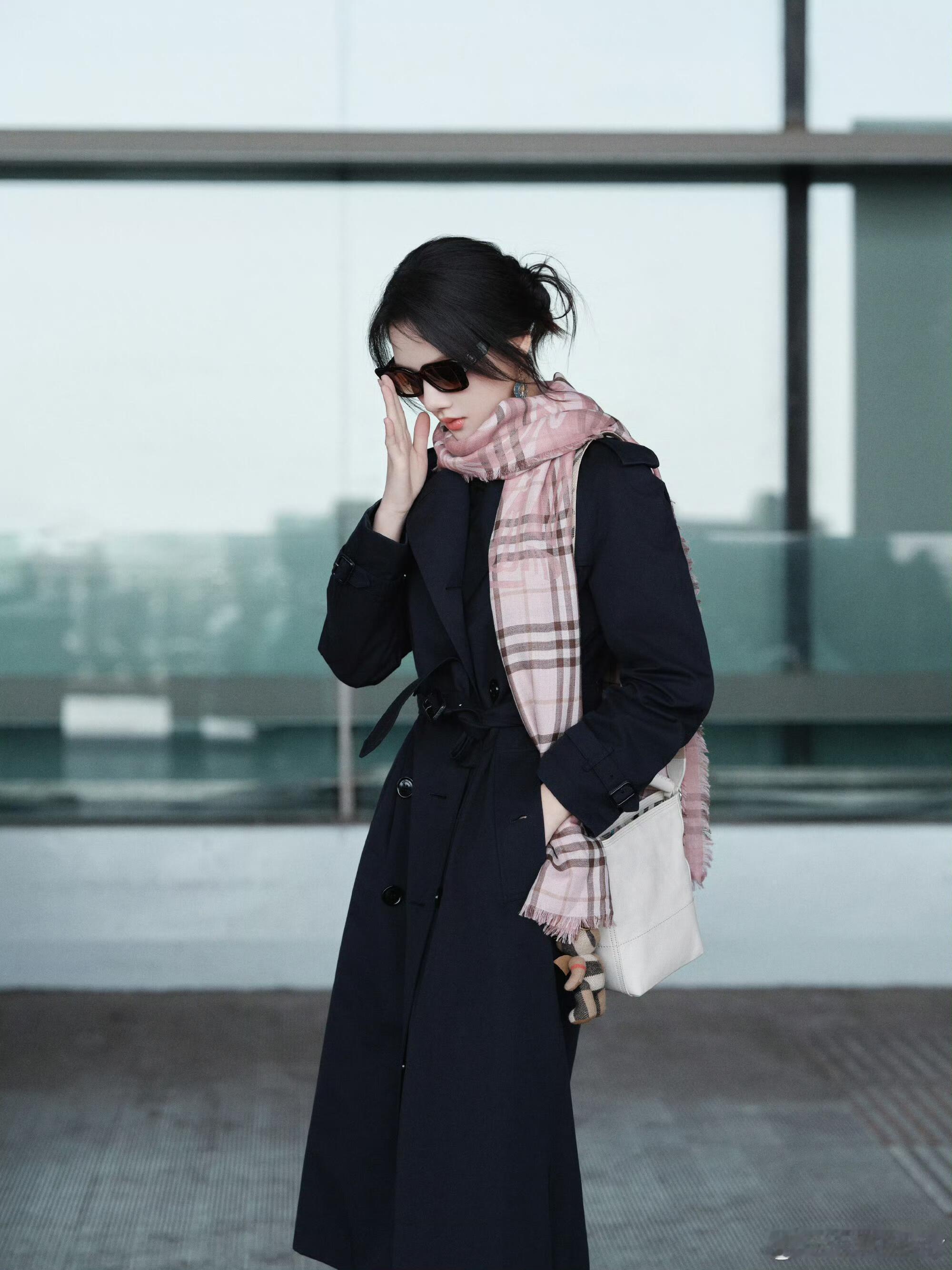 时装周伦敦时装周 任敏出发伦敦时装周,粉格围巾配低盘发尽显东方韵味,优雅与松弛感