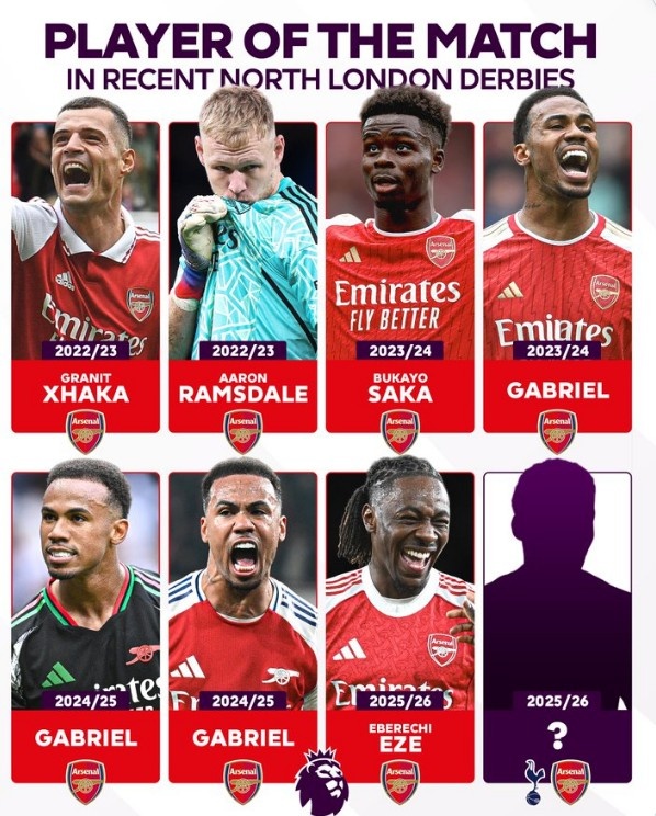 直播吧2月22日讯本轮英超将迎来焦点战阿森纳vs热刺,英超官方统计,近7次英超北伦敦德比官方全场最佳球员都是阿森纳球员,具体如下: