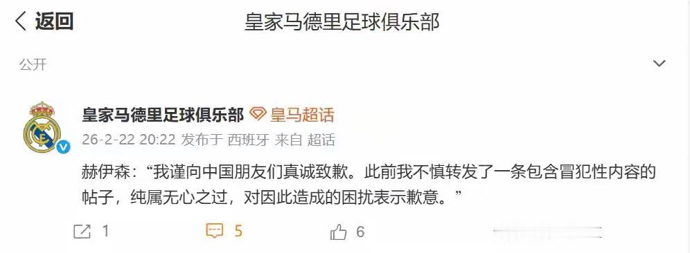 三个关键数据揭示皇马球员 赫伊森 事件严重性: 一,8000条球迷抗议: 事件发酵后,赫伊森社媒被中国球迷刷屏近8000条评论要求正式道歉 二,48小时沉默期: 从2月21日晚转发到2月22日晚官博道歉,皇马沉默了近24小时 三,单平台道歉: 道歉仅出现在皇马官博,官网、推特及赫伊森个人社媒均未同步,被批"中国特供" 皇马的双重标准令人失望 讽刺的是,就在2月20日,皇马刚发布公告重申对种族歧视"零容忍",2月17日还就维尼修斯被歧视事件向欧足联申诉。 但当歧视对象变成中国人,皇马的处理明显迟缓且缺乏诚意。