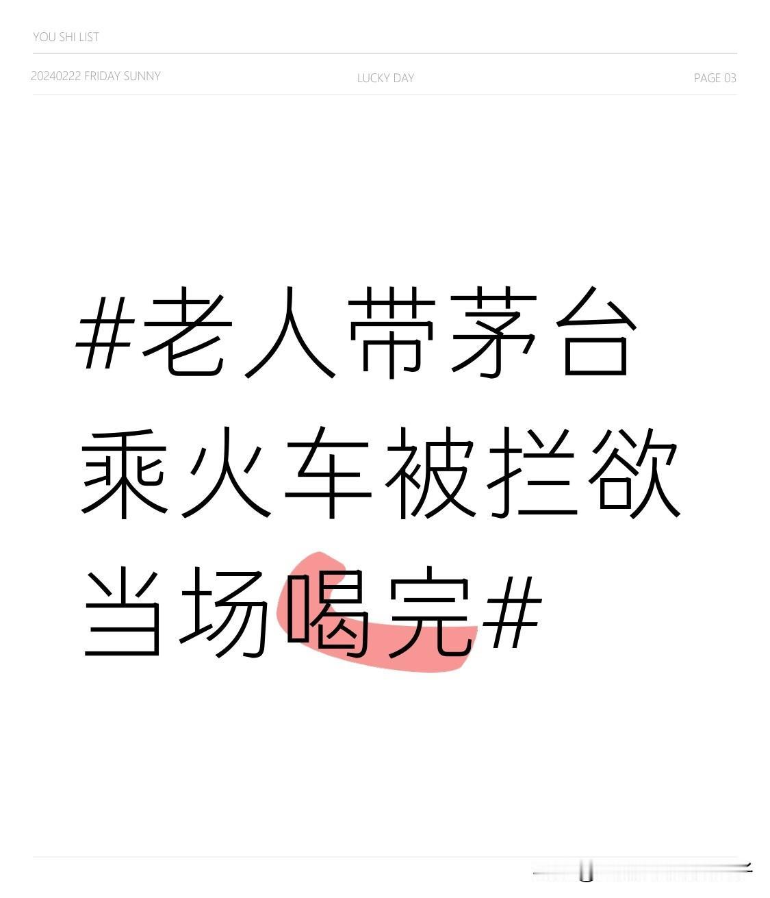 老人带茅台乘火车被拦欲当场喝完 最近“老人带茅台乘火车被拦欲当场喝完”的事儿闹得挺火。在长沙南站,一位近七旬老人带两瓶53度飞天茅台准备坐高铁,因超量被拦下。老人急了,说这是给儿子结婚的喜酒,以前坐火车都没事,还当场要拧开喝掉。这也不怪老人激动,毕竟是重要的喜酒。 其实类似的事儿不少,之前还有俩六旬战友带白酒被拦,直接花10分钟喝完两瓶上车。铁路新规是为了公共安全,但也得考虑下旅客感受,在保障安全和照顾人情上找到更好的平衡,不然老人遇到这种情况得多闹心啊。