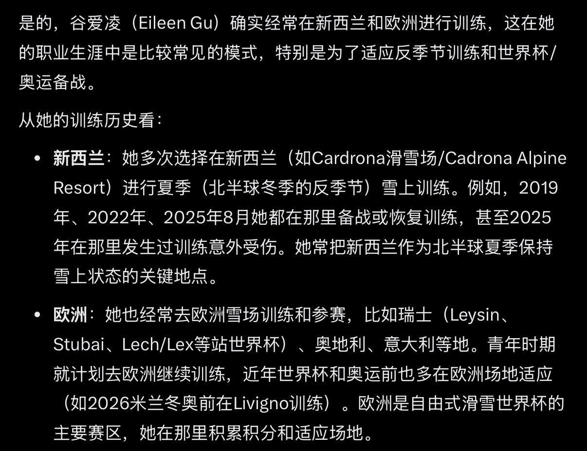 🔻事实核查:新西兰和欧洲是谷爱凌反季节/国际级训练的两个核心地点,尤其备战冬奥时频繁出现。她是全球流动训练的运动员,不完全局限于这两个地方,她也在中国(如崇礼云顶、Nanshan滑雪场)训练。特别是在2025-2026赛季,她在新西兰重返雪场备战米兰冬奥,也在欧洲(如瑞士莱克斯)拿下世界杯冠军。 🔻在国外训练怎么了?在国外训练的中国运动员多了。🔻图1这是什么样的中文用户,会用贝森特、JD万斯同样的逻辑,对为中国争光的运动员进行攻击?谷爱凌金牌谷爱凌唱国歌全民聊冬奥海外新鲜事