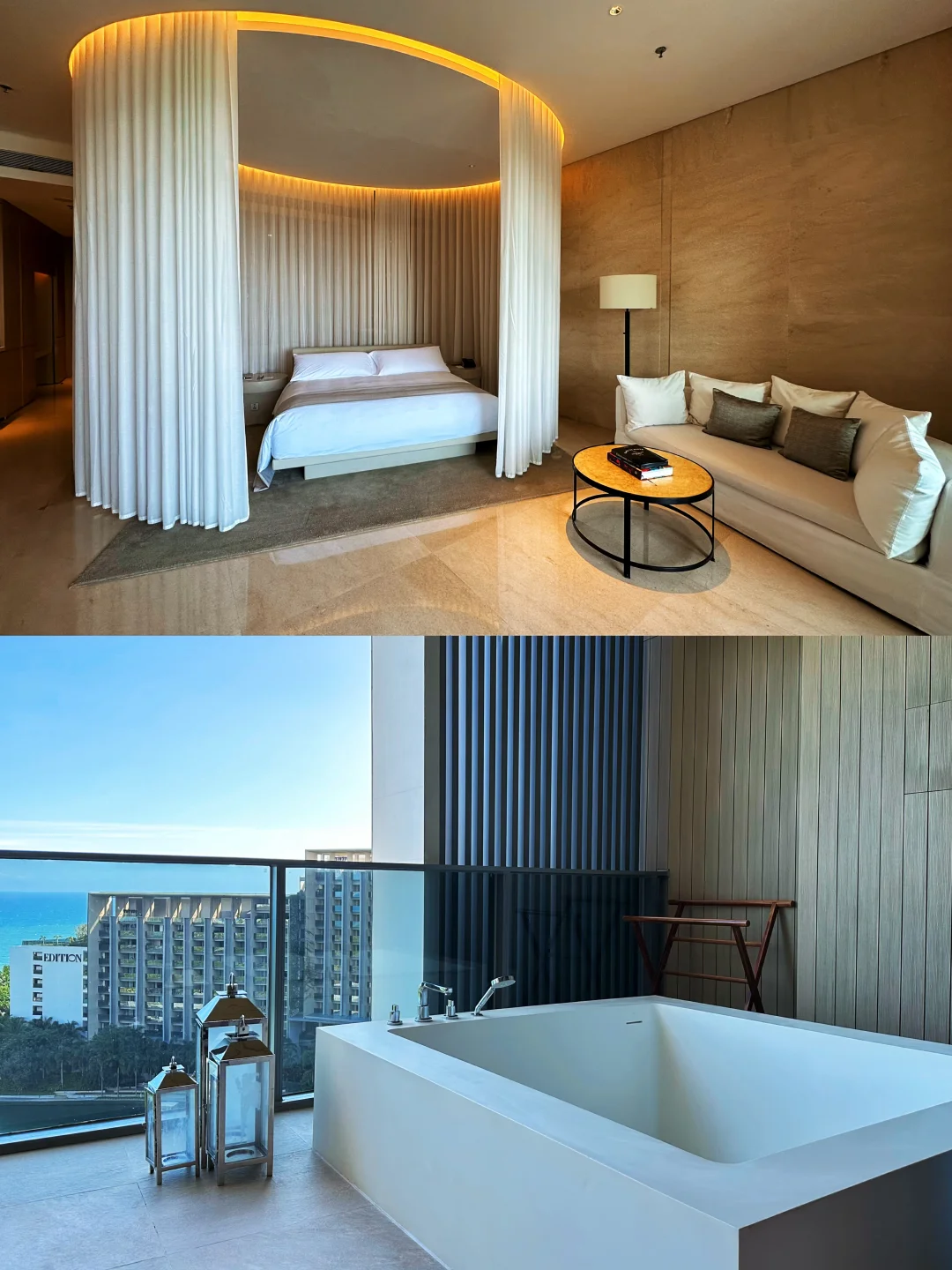 这次订了全海景风尚套房,房间空间开阔,海风能直接吹进阳台。家人是头一回来这种设计型酒店,一开始好奇,后来喜欢。