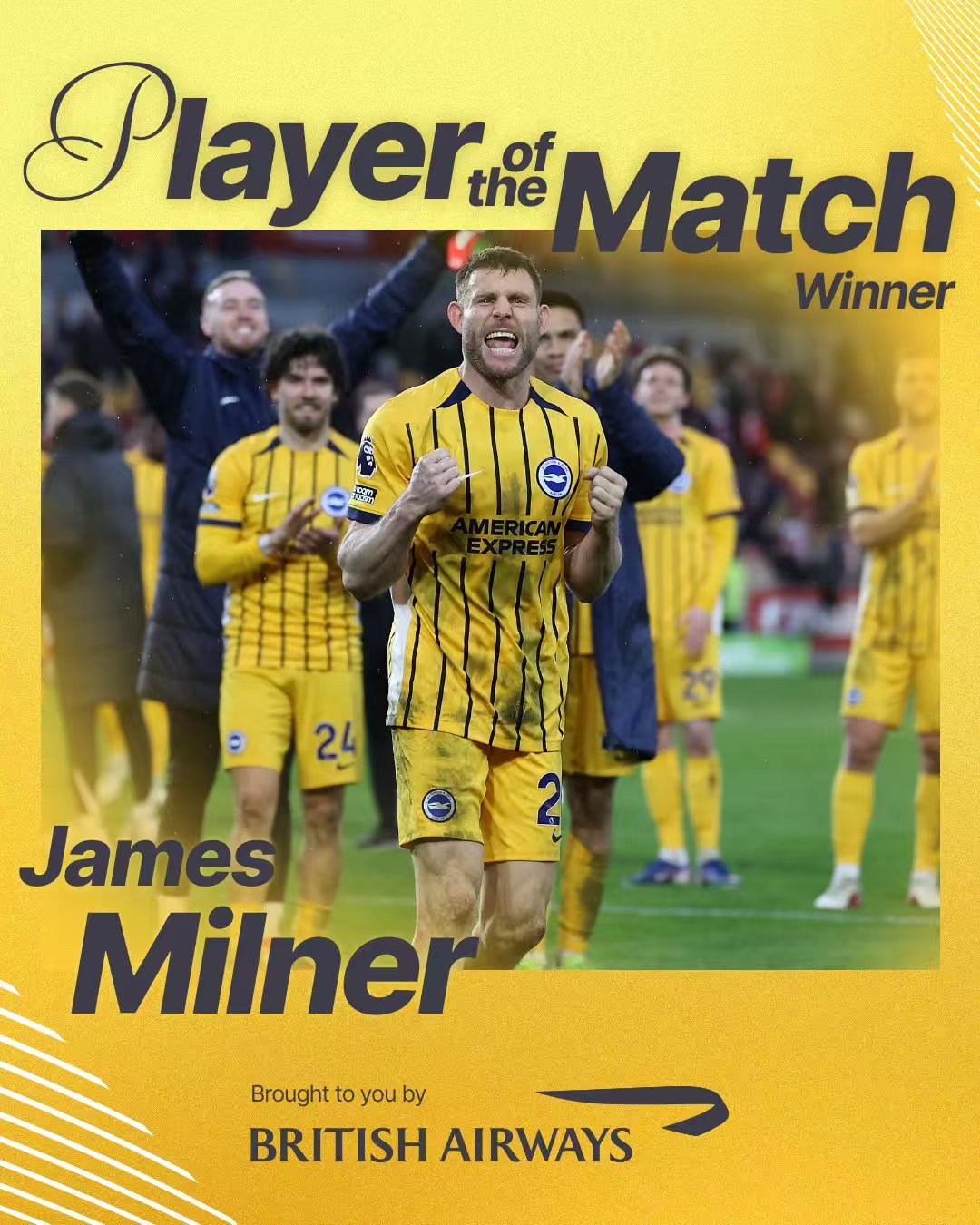 虎扑02月22日讯布莱顿官方宣布,球队老将詹姆斯-米尔纳在对阵布伦特福德的比赛中,凭借稳定而关键的表现,当选为本场比赛的最佳球员。