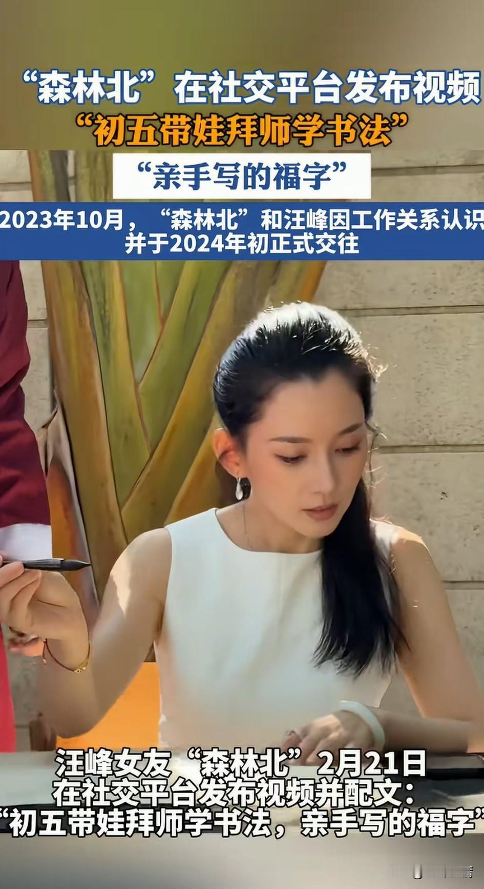 森林北在网络平台发布视频, 初五带娃去拜师学书法, 2023年10月汪峰和森林北因为工作关系相识,看到森林北风韵犹存, 汪峰惊为天人, 两人迅速开启了一段忘年恋, 连汪峰的前妻都说, 他们两个人就是搭伙过日子, 网友笑称汪峰从来不便宜小弟弟, 汪峰数次结婚,数次离婚, 这次和森林北就不结婚了, 毕竟结了再离也比较麻烦, 于是两人干脆以男女关系同居, 森林北是单位内部的人, 可以说和娱乐圈的王峰显然不搭, 但是两个人搭伙过日子也就不讲究那么多了,两人在一起也很开心, 经常去各地旅行, 这次还带着媳妇儿去拜师学艺, 顺便给森林北的孩子介绍给著名的书法家,这也算是投桃报李了, 大家觉得汪峰和森林北能走到最后吗? 汪峰 森林北素颜 魅力网红森林北 单亲妈妈森林北