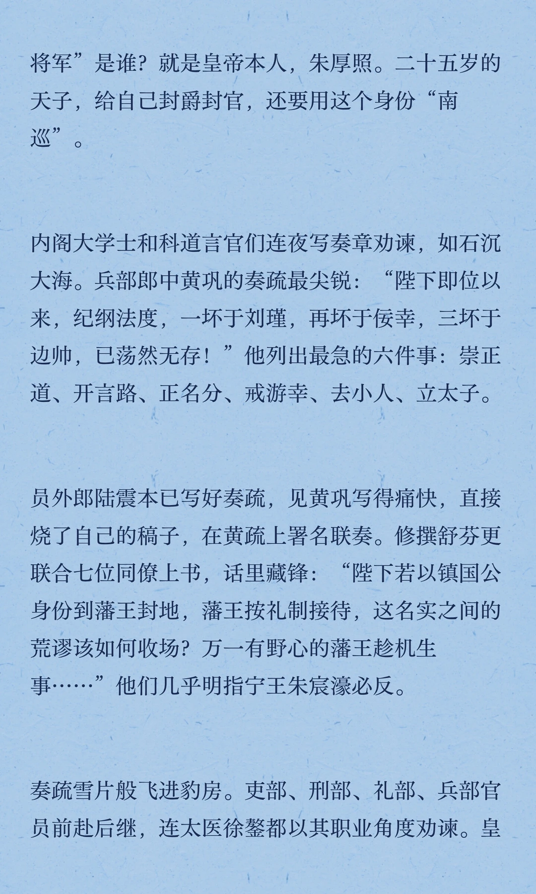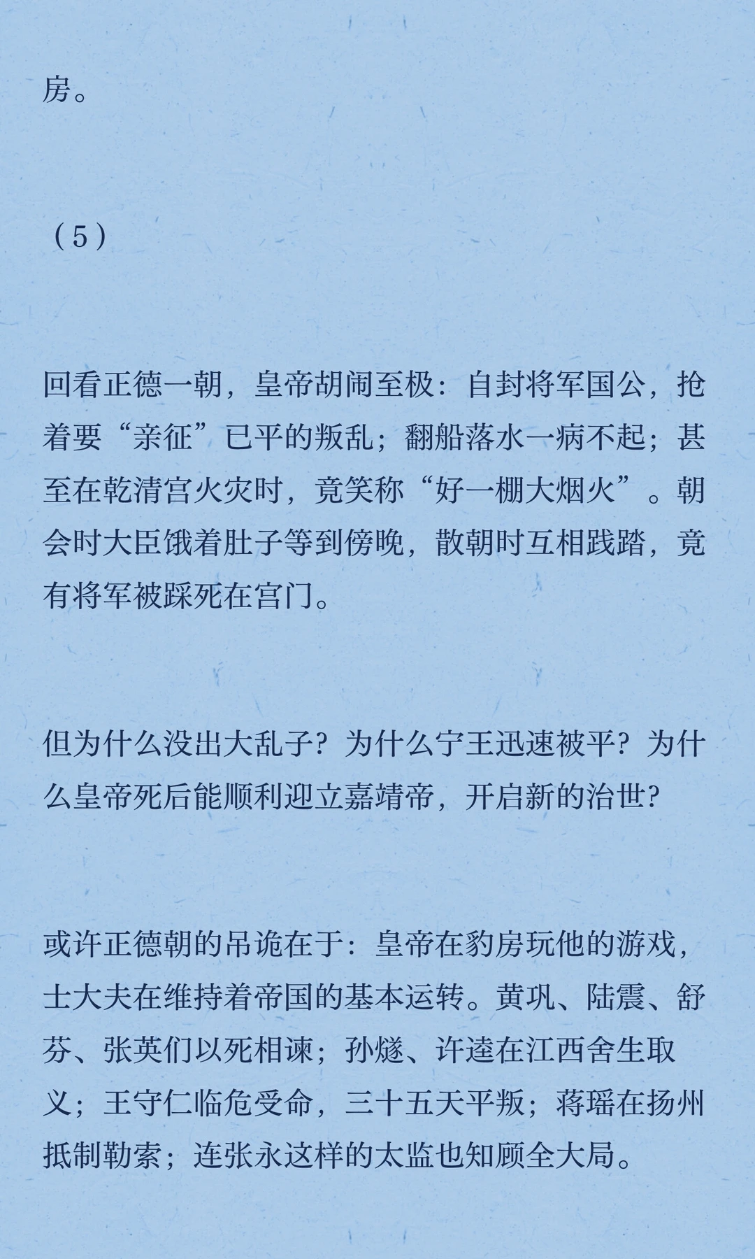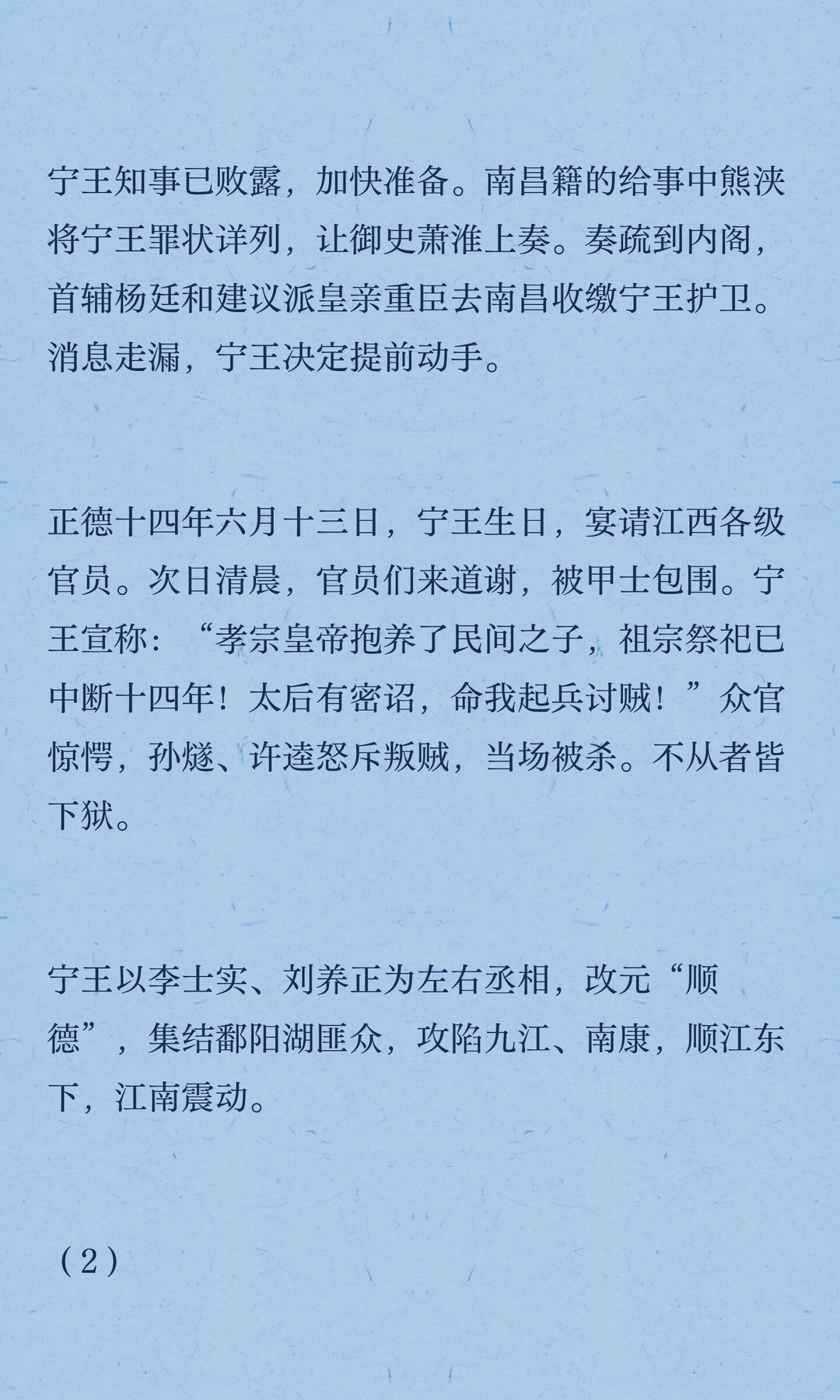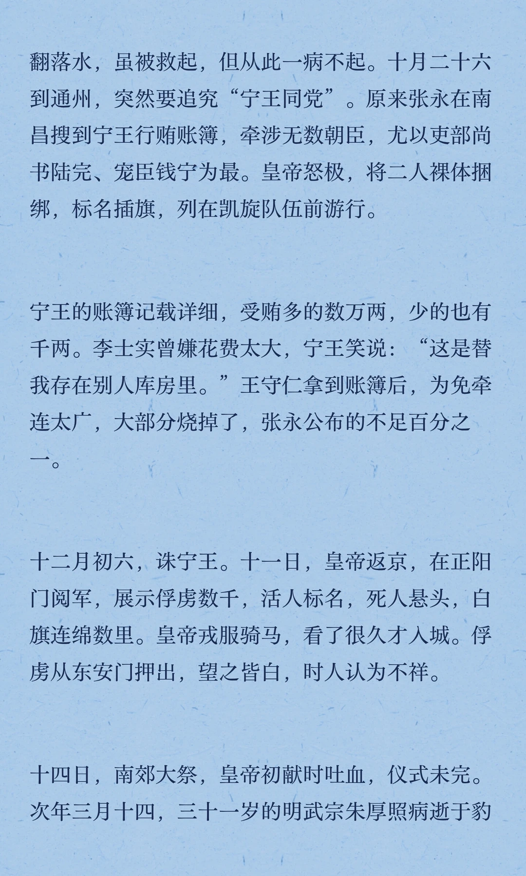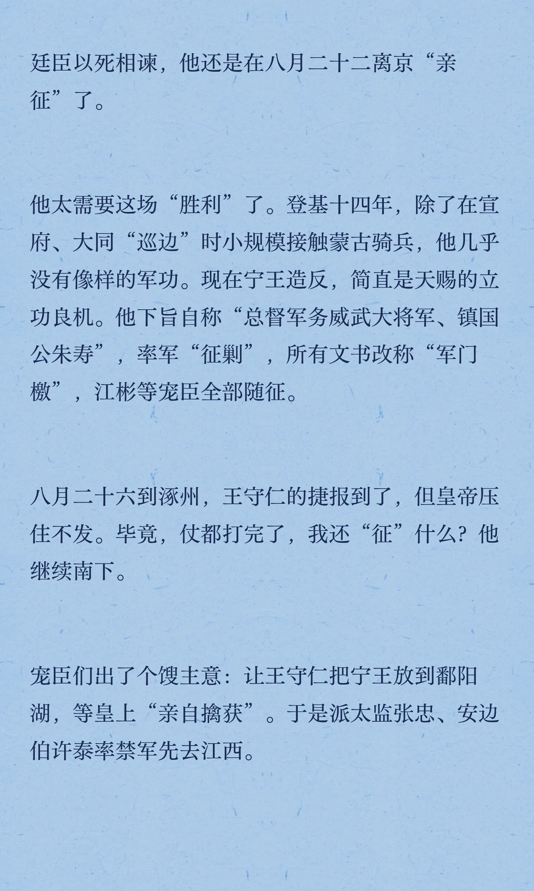 正德十四年,朱厚照封自己为镇国公,南巡引发宁王朱宸濠叛乱。王守仁三十五天平定叛乱,皇帝病逝,嘉靖帝即位。正德朝官僚体系在皇帝荒诞行为下维持运转,最终因皇帝失灵而崩溃。
