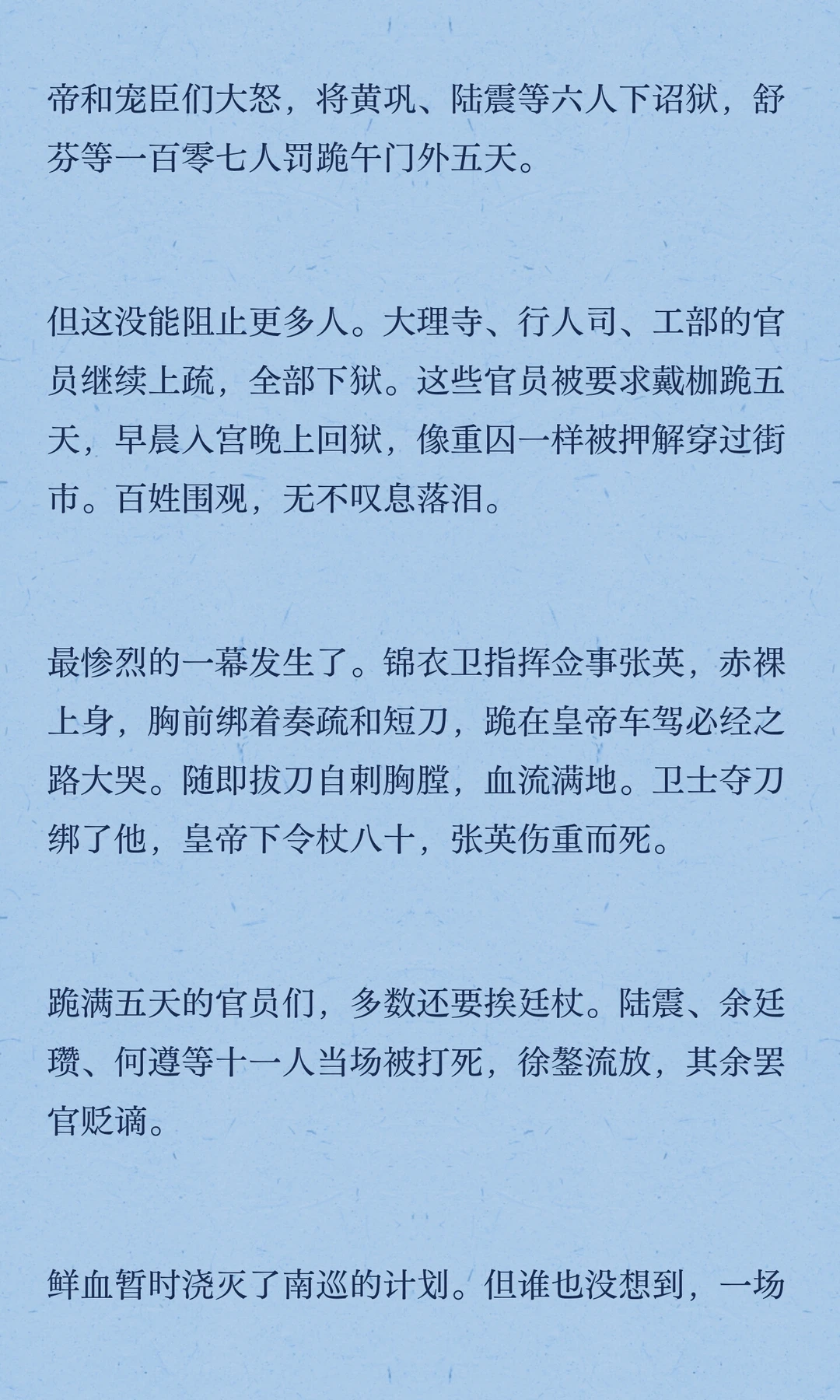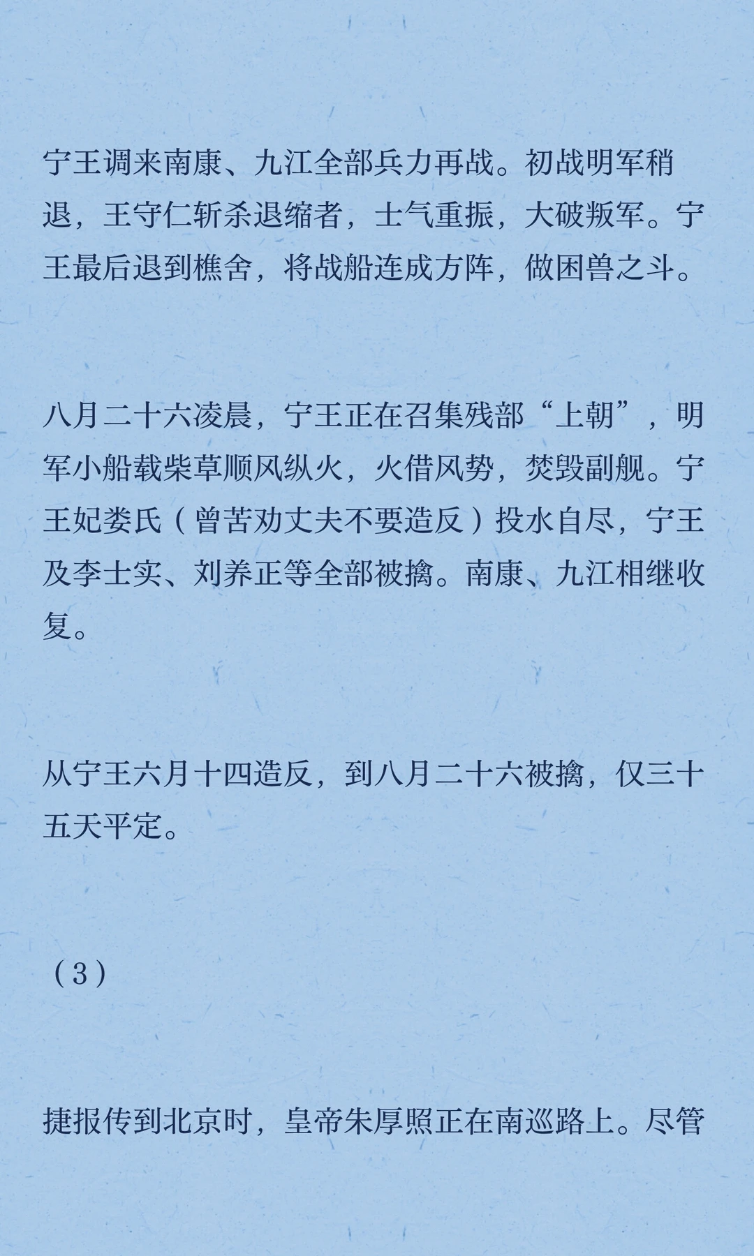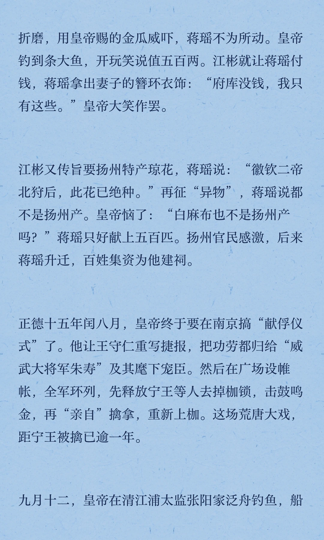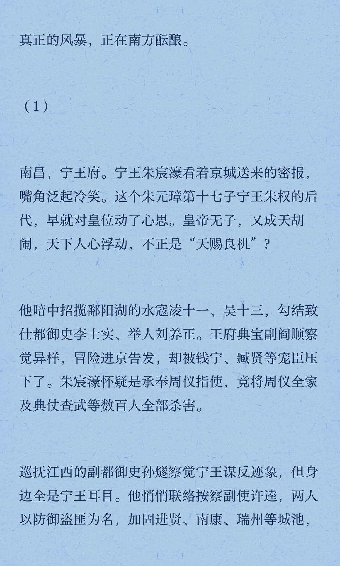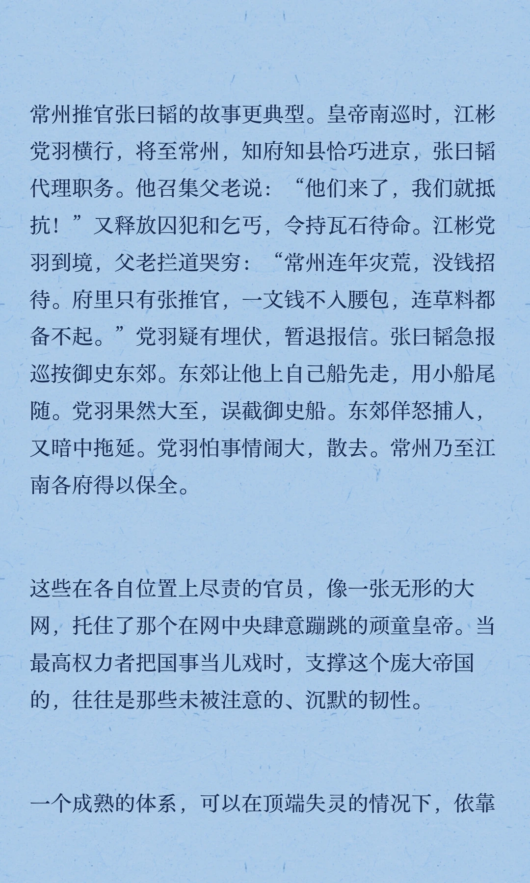 正德十四年,朱厚照封自己为镇国公,南巡引发宁王朱宸濠叛乱。王守仁三十五天平定叛乱,皇帝病逝,嘉靖帝即位。正德朝官僚体系在皇帝荒诞行为下维持运转,最终因皇帝失灵而崩溃。