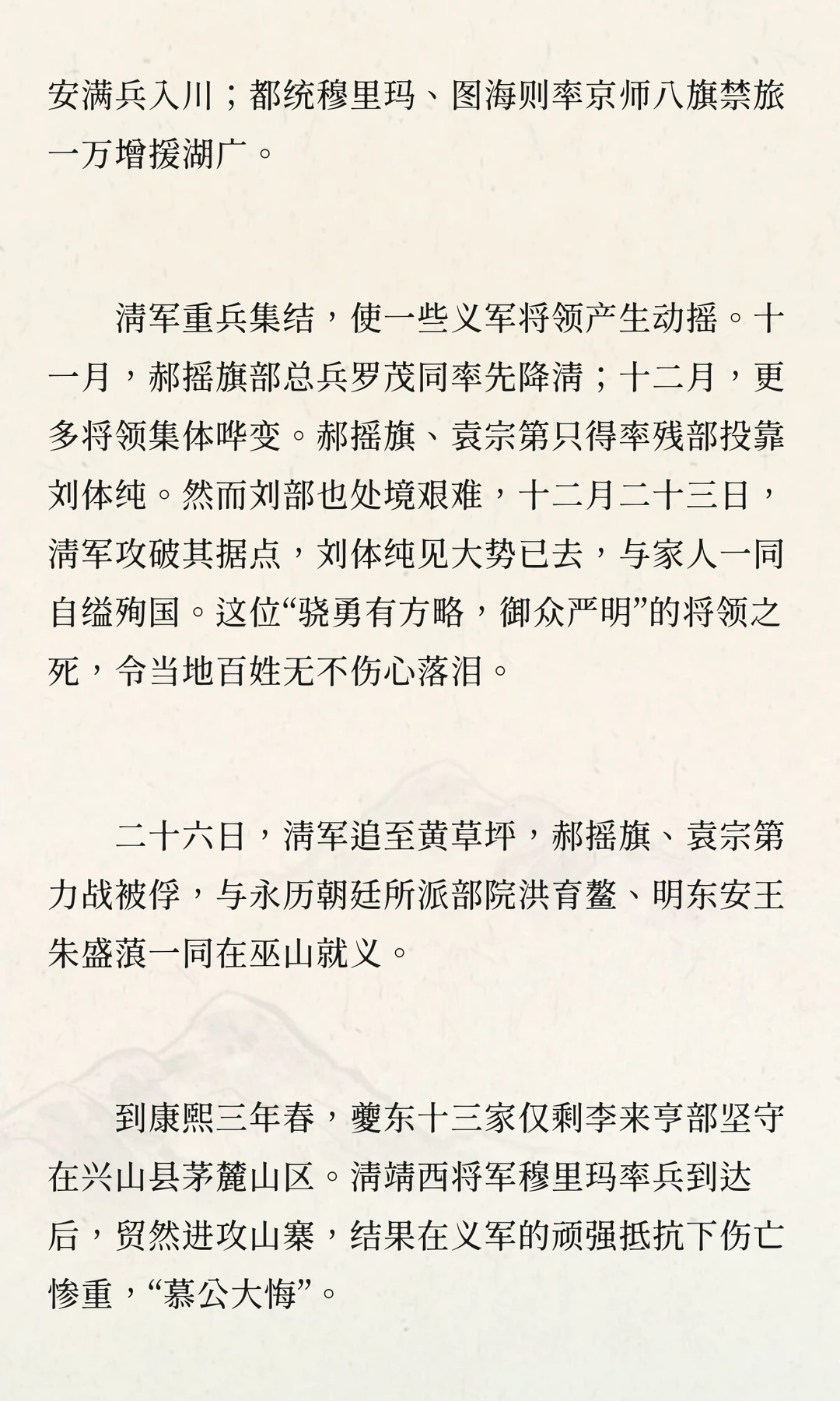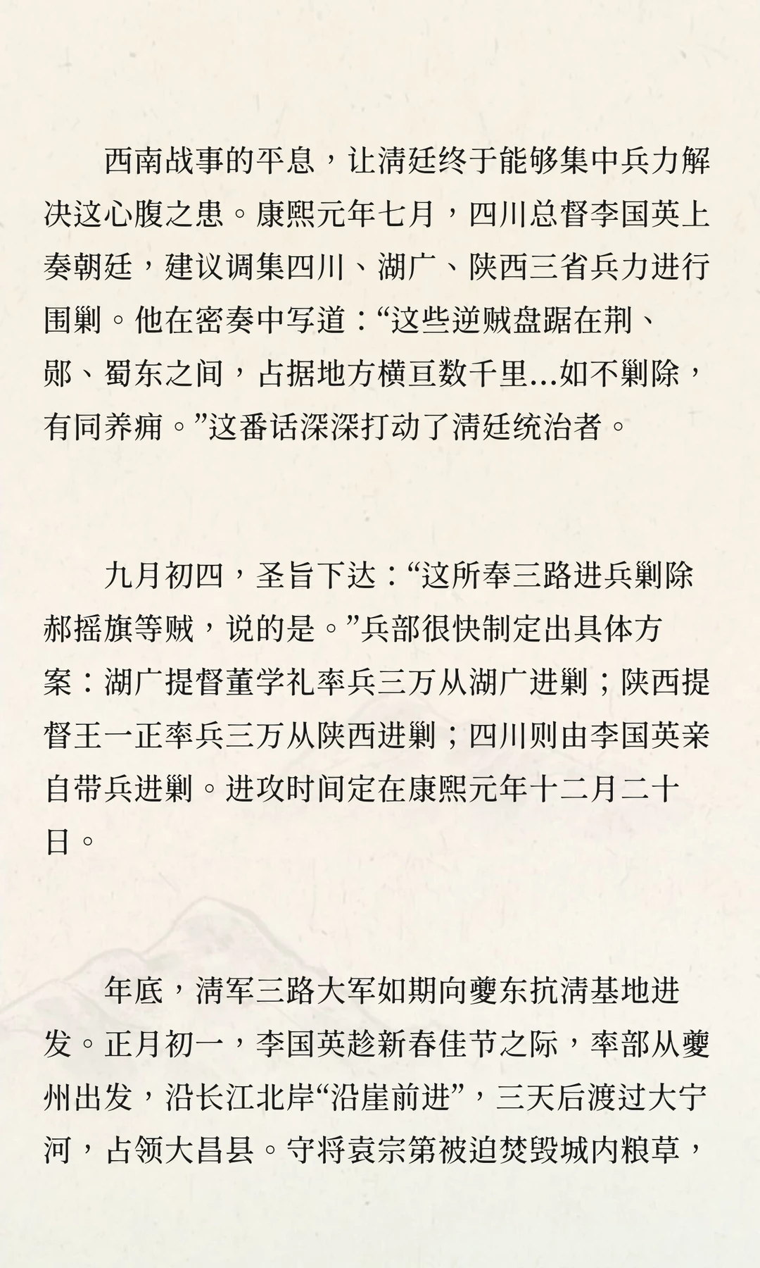 康熙年间,李定国病逝后,夔东十三家成为抗清最后堡垒。清廷调集三路大军围剿,最终在1646年彻底平定。这场持续20年的抗清斗争,展现了义军的英勇与牺牲,也为清廷调整政策提供了历史背景。