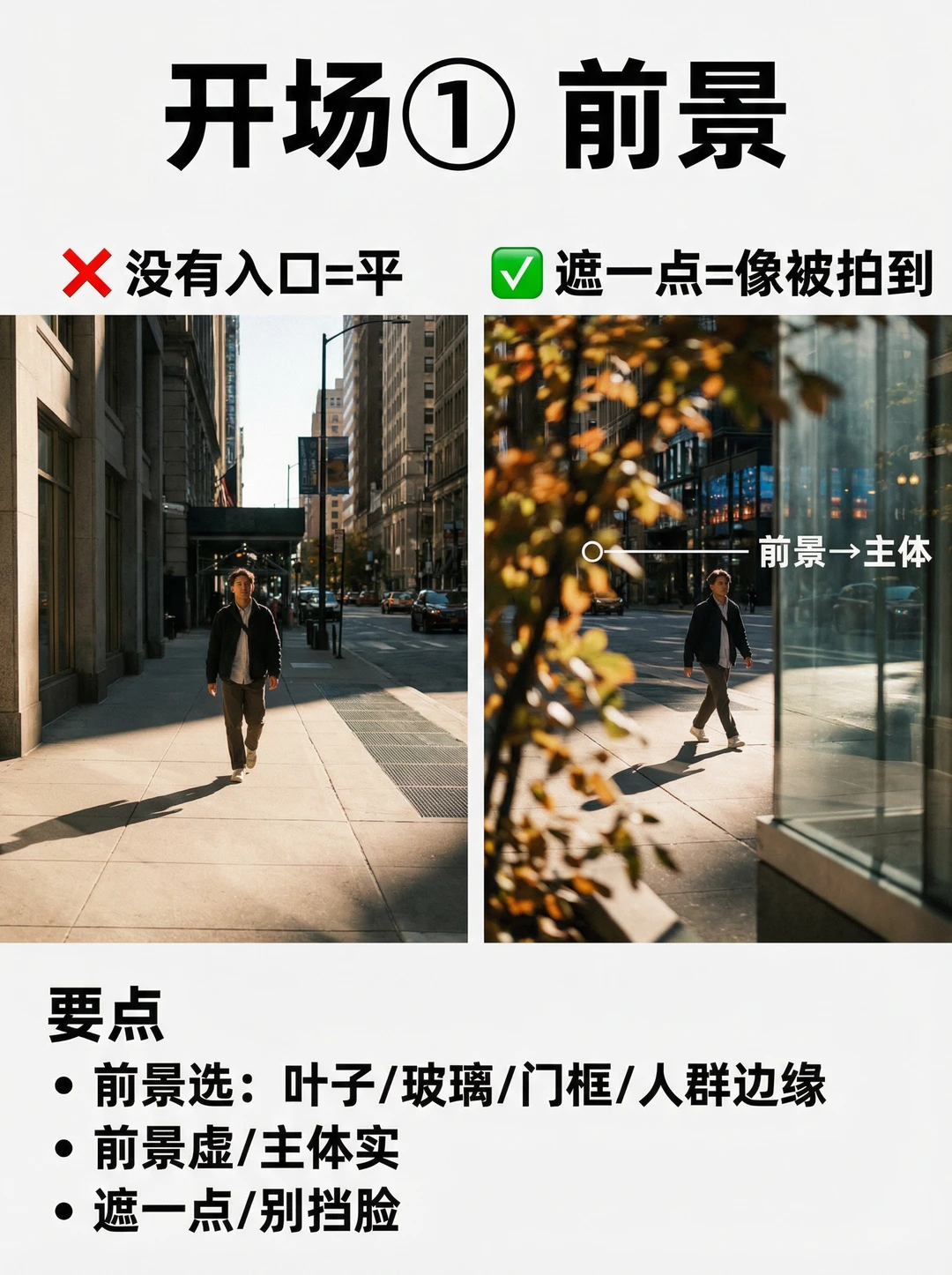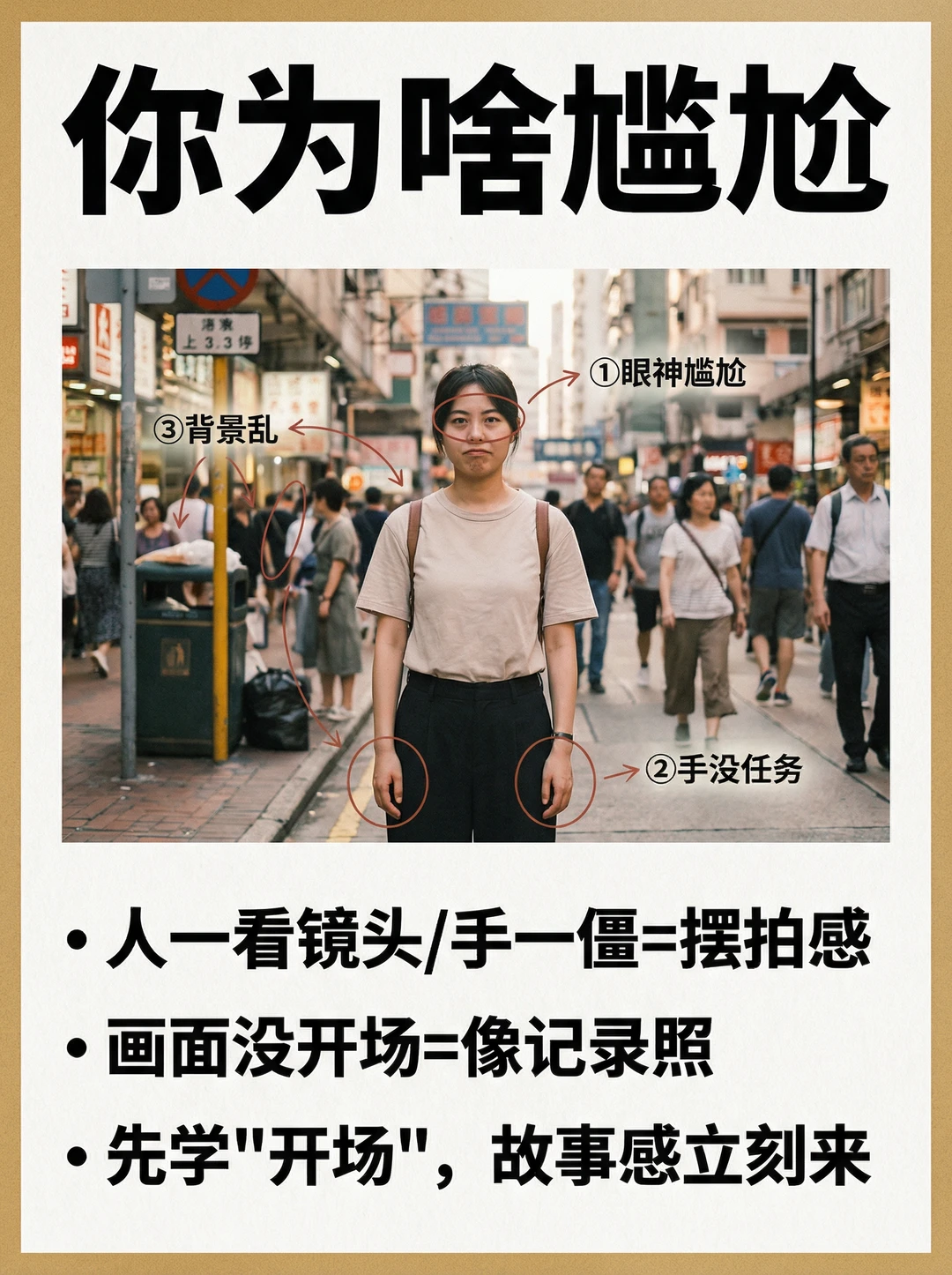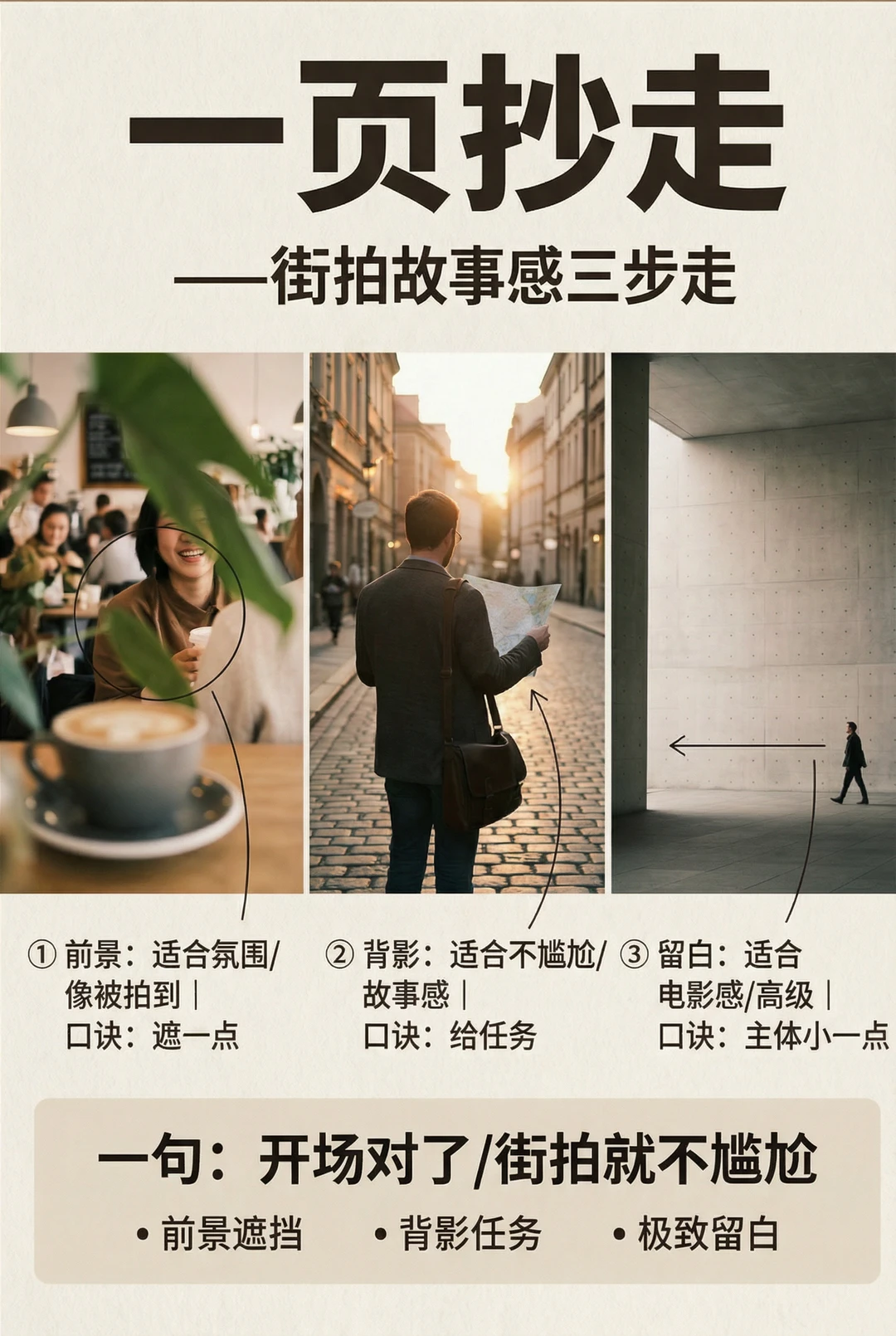 你有没有这种崩溃👇 📸 街拍一举起相机就尴尬:人一看镜头像摆拍,画面还像游客记录照😩 其实街拍想有“故事感”,关键不是器材,而是先学会——开场✅ 这期我给你3种最稳的开场方式,直接照抄就能用✨ ① 前景:遮一点/虚一点,立刻像“被拍到” ② 背影:不看镜头=直接不尴尬,故事自动来 ③ 留白:把情绪放到画外,画面立刻更电影 记住一句:开场对了,街拍就不尴尬📌