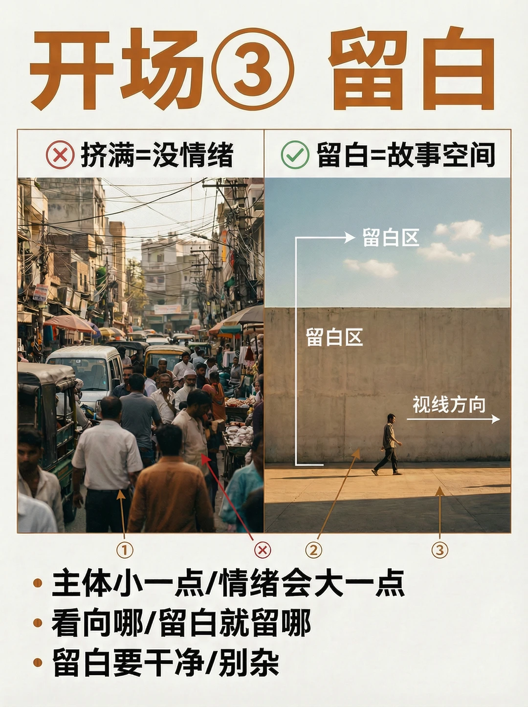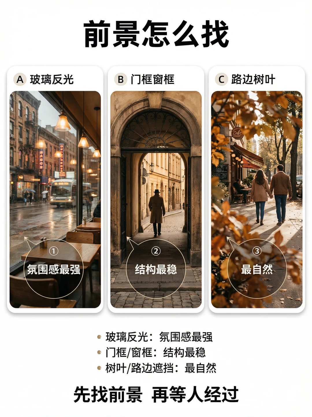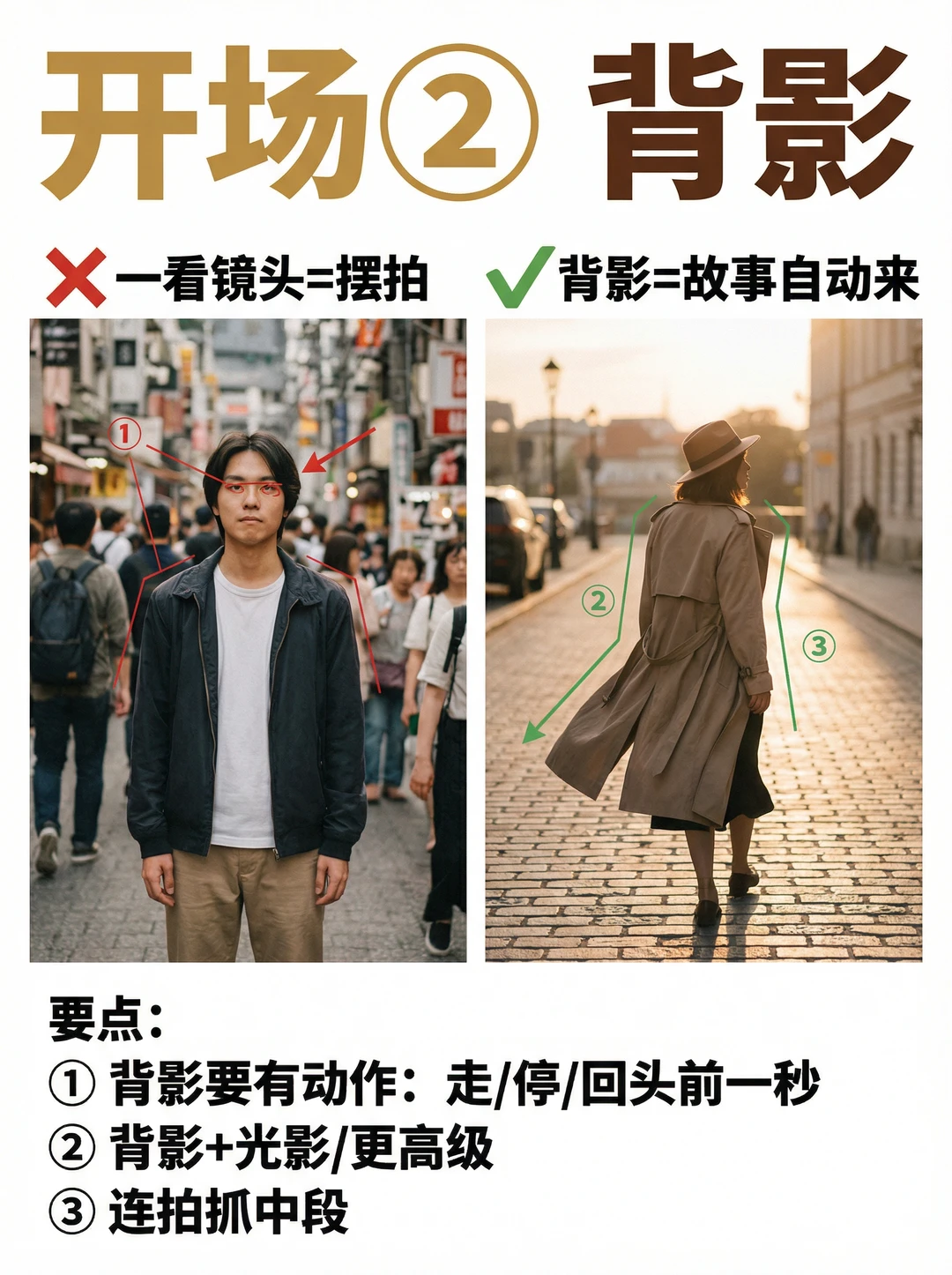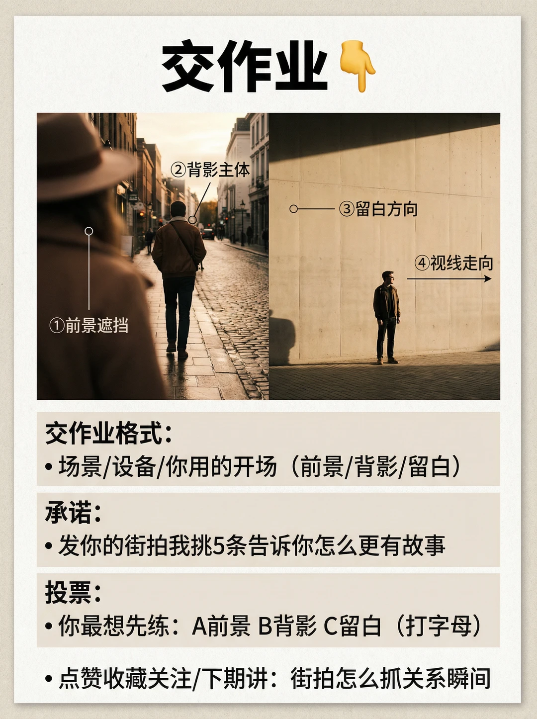 你有没有这种崩溃👇 📸 街拍一举起相机就尴尬:人一看镜头像摆拍,画面还像游客记录照😩 其实街拍想有“故事感”,关键不是器材,而是先学会——开场✅ 这期我给你3种最稳的开场方式,直接照抄就能用✨ ① 前景:遮一点/虚一点,立刻像“被拍到” ② 背影:不看镜头=直接不尴尬,故事自动来 ③ 留白:把情绪放到画外,画面立刻更电影 记住一句:开场对了,街拍就不尴尬📌