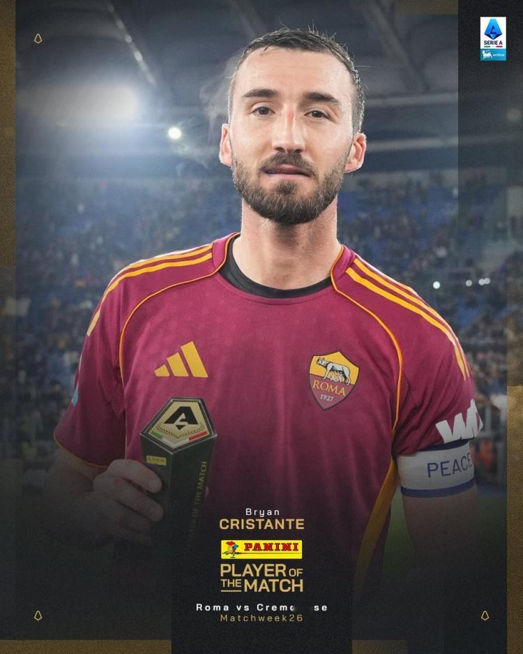 传射建功!克里斯坦特当选罗马vs克雷莫内塞全场最佳球员