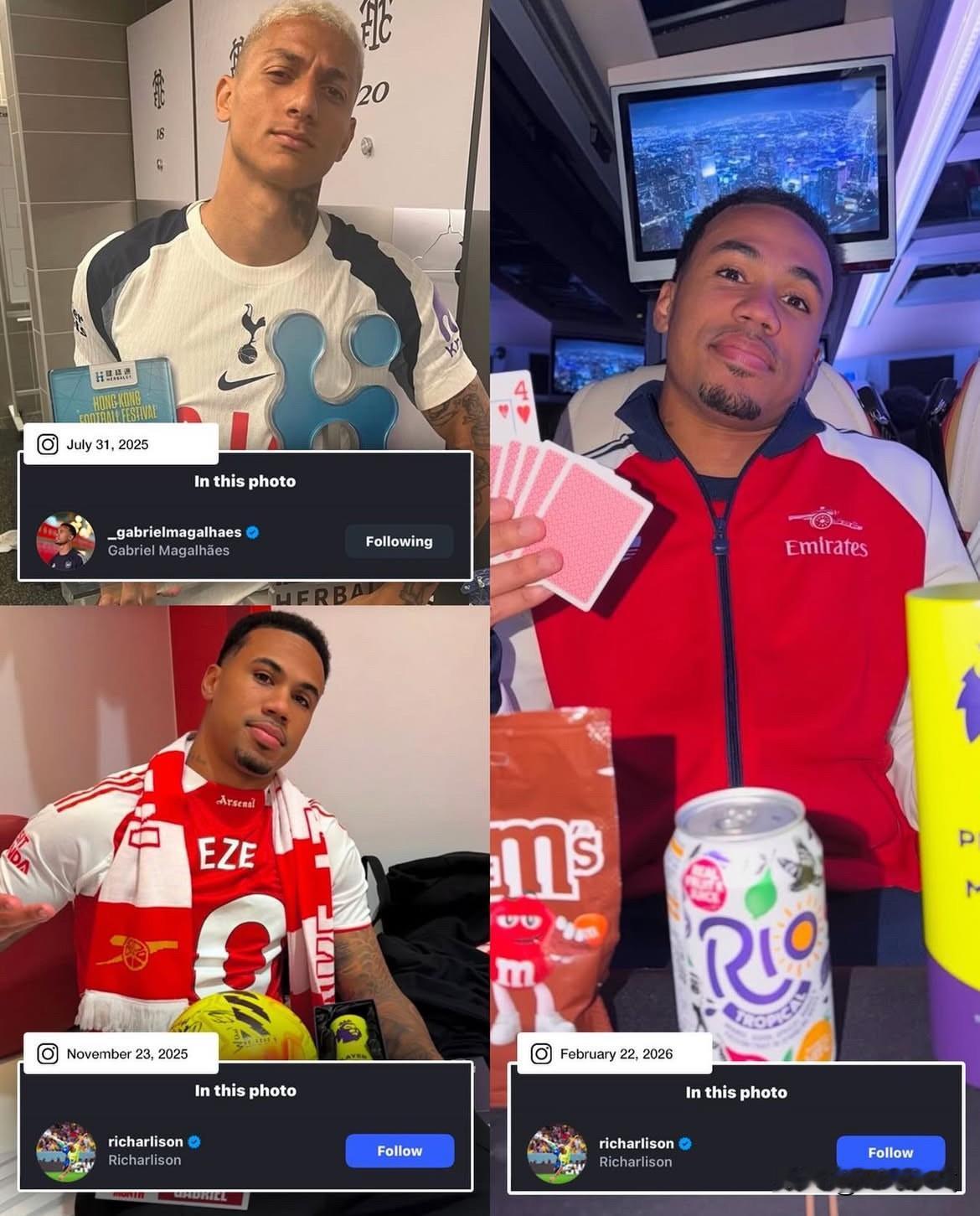 最终,阿森纳4-1联赛双杀热刺。 赛后加布里埃尔更新个人社交媒体,他还特意艾特了理查利松! 此前,热刺在香港战胜阿森纳后,理查利森晒出自己捧起冠军奖杯和最佳球员奖的照片,并@ 加布里埃尔。 加布里埃尔随后晒出自己在北伦敦德比中获得的三座英超最佳球员奖杯,并@ 理查利森。 理查利森又晒出了热刺的欧联冠军奖杯回击…… 如今,看起来两人这互怼没完没了了。