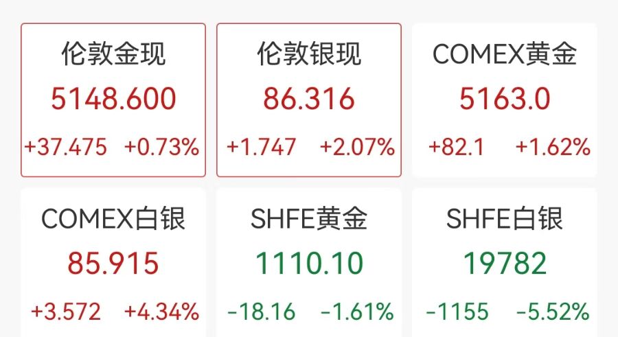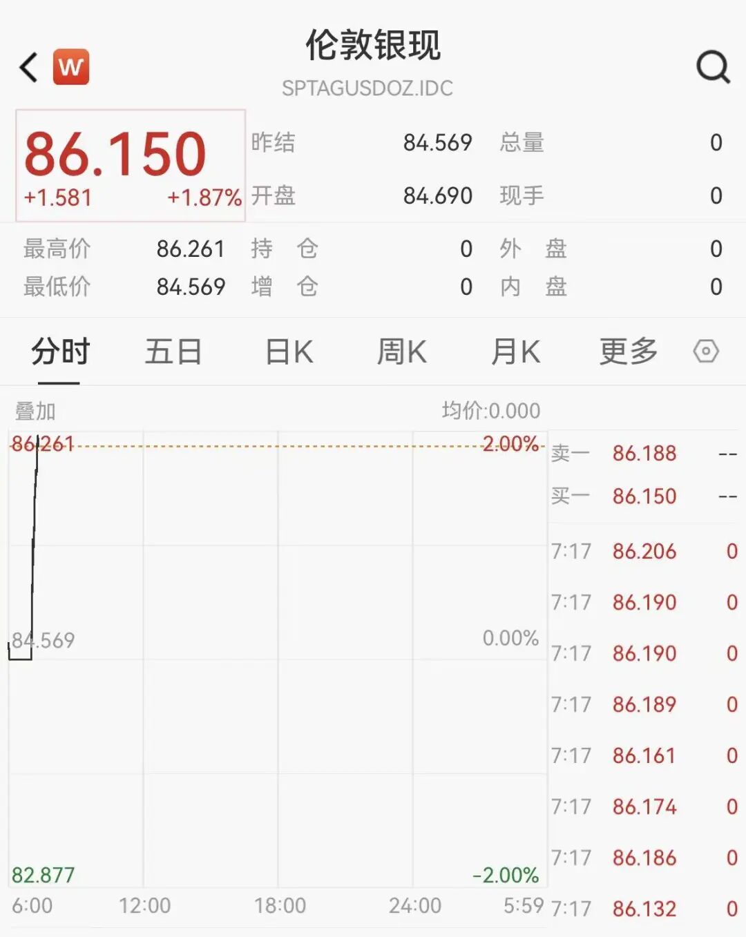 现货白银日内涨幅扩大至2.07%,报86.316美元/盎司。纽约期银站上86美元/盎司,日内涨超4%。纽约期金日内涨1.62%。