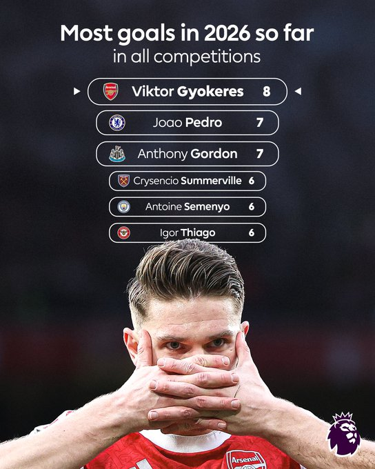 英超官方数据统计显示,截至目前他在2026年各项赛事已打进8球,暂时领跑“英超球员2026年(自然年)各项赛事进球榜”。