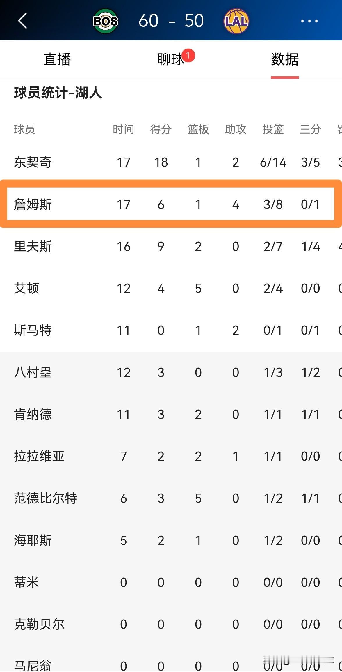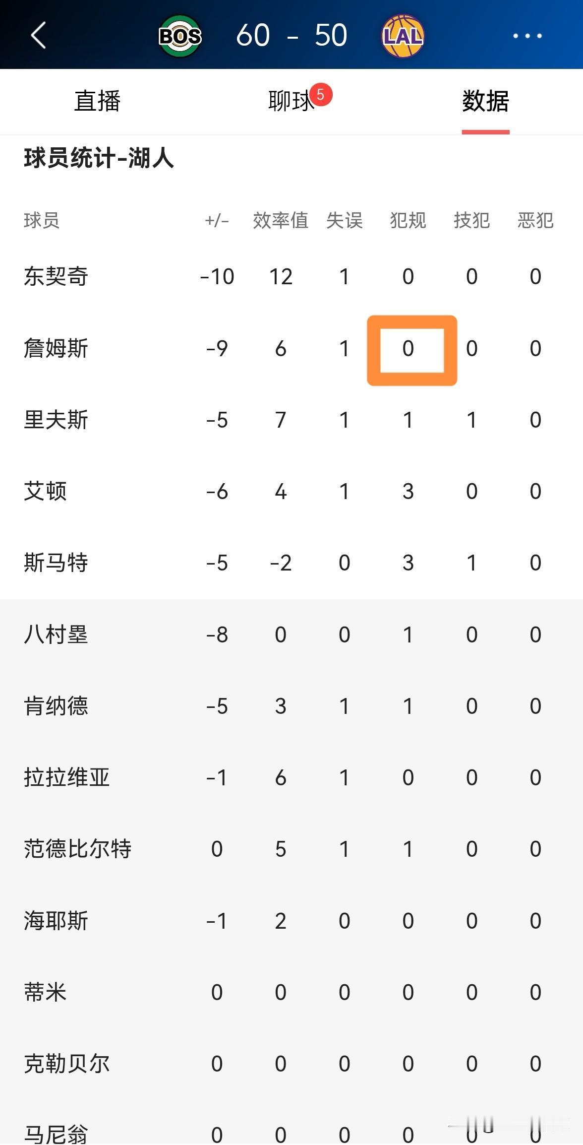 湖人超级巨星詹姆斯的防守真是太干净了!在今天湖人主场迎战凯尔特人的比赛中,目前双方半场战罢,湖人以50:60落后于对手。值得一提的是,在前两节比赛中,詹姆斯在防守端显得非常懈怠,他没有出现任何的犯规。 在上半场比赛中,詹姆斯首发出战17分钟,投篮8中3,其中三分球1中0得到6分1篮板4助攻1抢断,没有出现犯规,他的场上正负值为-9。 毫不夸张的说,如果詹姆斯在下半场比赛中继续保持这么干净的防守,那么湖人必败无疑。