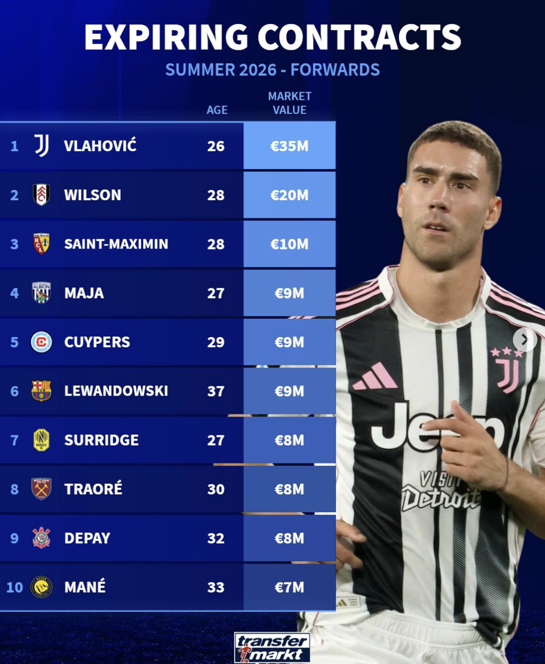 虎扑02月23日讯德转统计了今夏合同即将到期前锋身价榜。