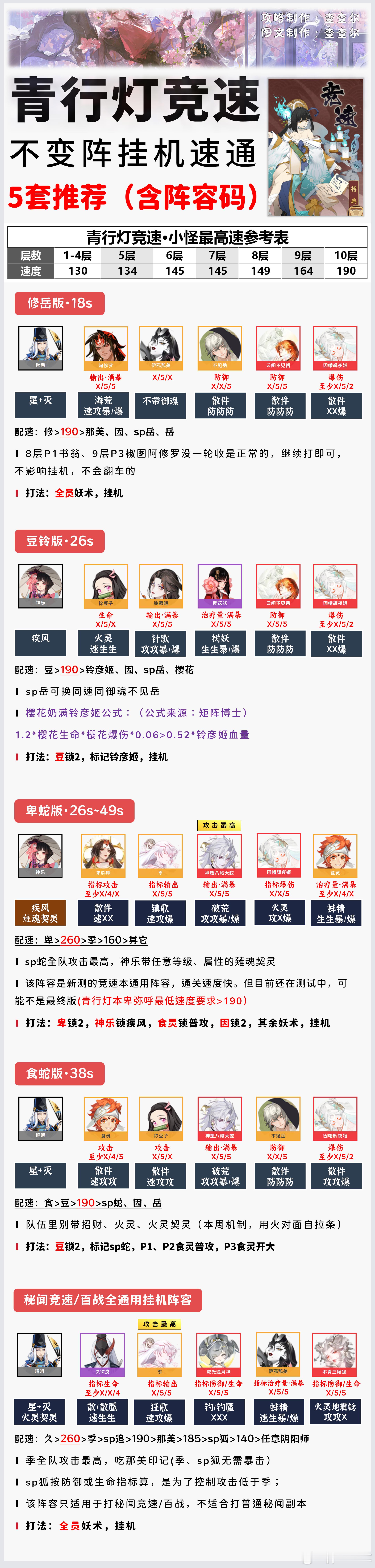 阴阳师手游超话创作官 【青行灯竞速】1-10层不变阵挂机,5套+阵容码■新增一套26s左右“蛇卑季”阵容,目前还在测试其竞速通用性(有望成为新的竞速通用阵容)文字码:①修美岳sp岳因(18s)|TA|297eae41811f81649d37e171de7cab34