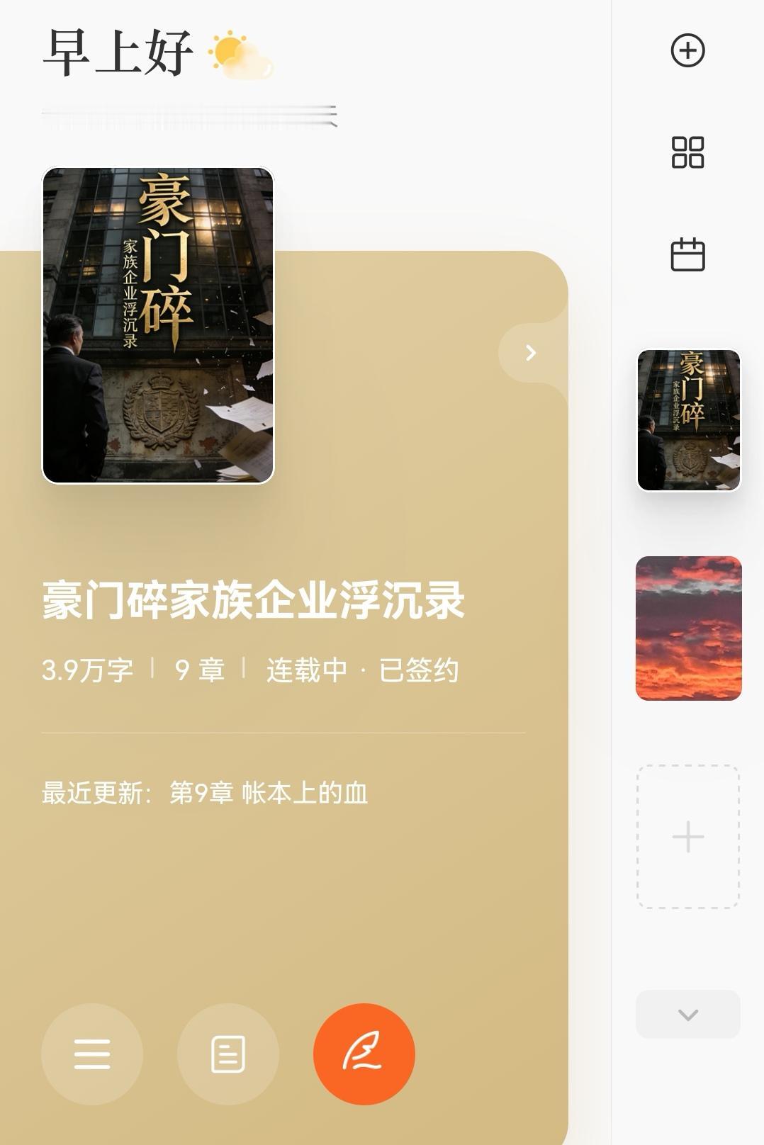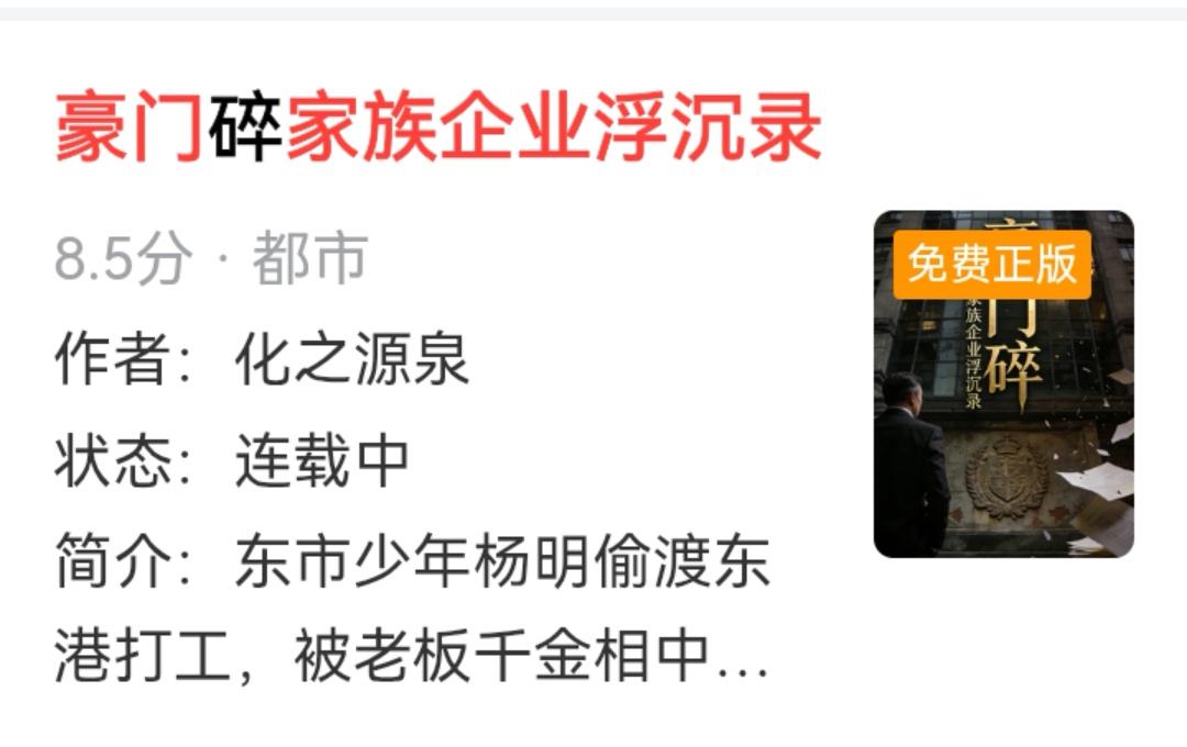 我的新小说《豪门碎 家族企业浮沉录》当天首发,当天签约,顺利签合同了。 蕃茄,头条上都有展现了! 从一个工科设计师向文科转行也是一个挑战,学习的革命,看到作品签的,感觉到有点愉悦! 总结了第一部小说没有弄明白平台的要求,页面设计不到位,书名和内容混乱,签约失败。 新书《豪门碎 家族企业浮沉录》,先设计好了书面,分卷,分章,重新创建新书,修改敏感词,规范文风,卡住了问豆包,然后发作品,结果几个小时后签合同了。 写这部小说,是在几十年和企业家的共事中,见到了太多的家族企业因为亲情牵扯,各怀心事,不能科学管理,而在很短时间内一下子破产的现状,尤其是上市公司,把经历扩展成小说,供参考讨论!