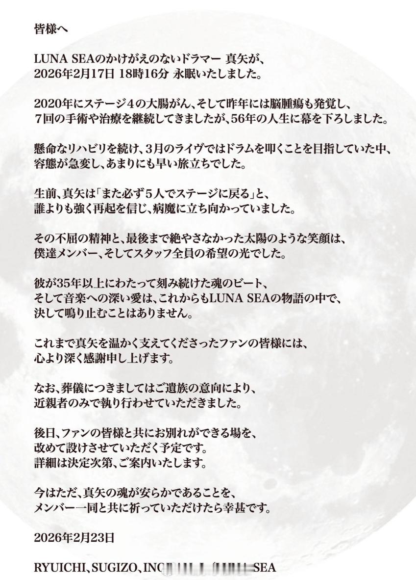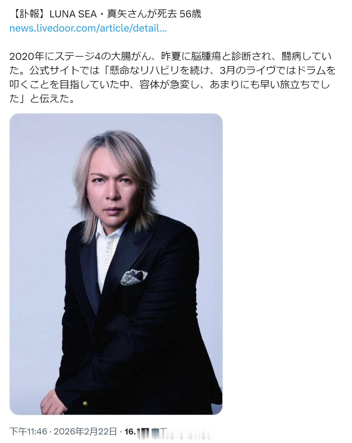 LUNASEA乐队成员真矢去世 据日媒,LUNA SEA乐队成员真矢去世,年仅56岁。据悉,他于2020年被诊断出患有四期结肠癌,去年夏天又被诊断出患有脑瘤。讣告称他一直在努力与病魔对抗,原计划今年3月重返舞台。