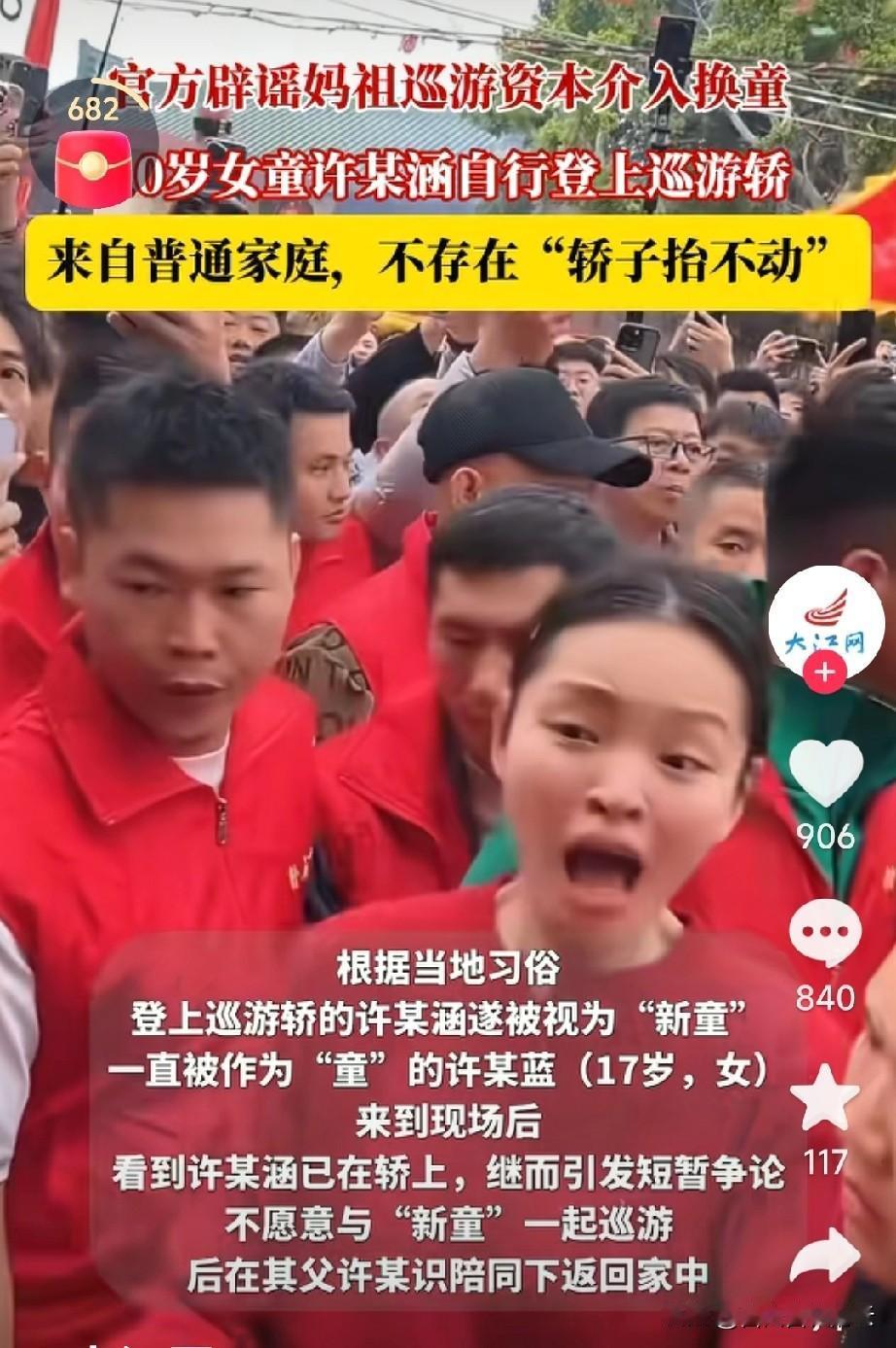 广东妈祖巡游换童这事官方通报了,不是资本介入,是10岁的女孩自己调皮爬上轿子的,