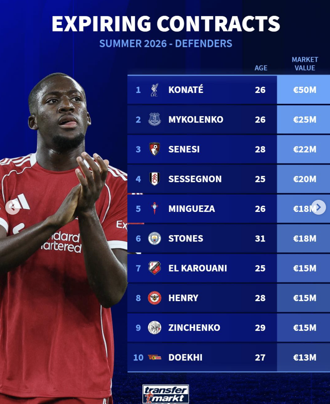 利物浦的科纳特以5000万高居榜首;埃弗顿的米科伦科和伯恩茅斯的塞内西分别以2500万和2200万排名二三。
