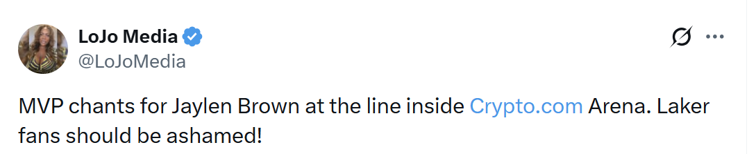 LoJoMedia写道:“杰伦-布朗站上罚球线时响起了MVP的呼声。湖人球迷应该感到羞愧!”