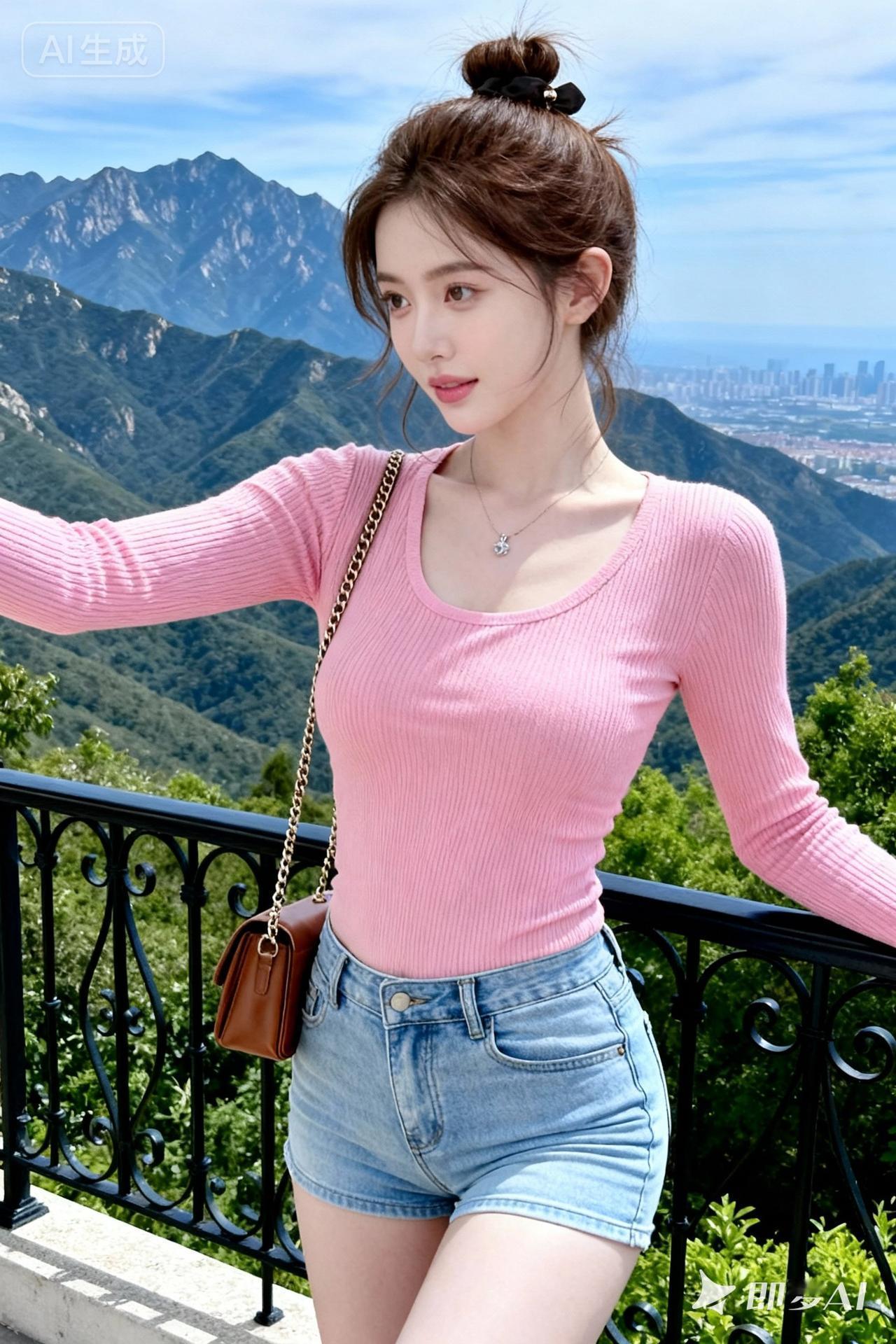 一位亚洲美女身处其中,她留着棕色发型,穿着粉色的修身长袖针织衫;浅蓝超紧身修身牛仔短裤;
