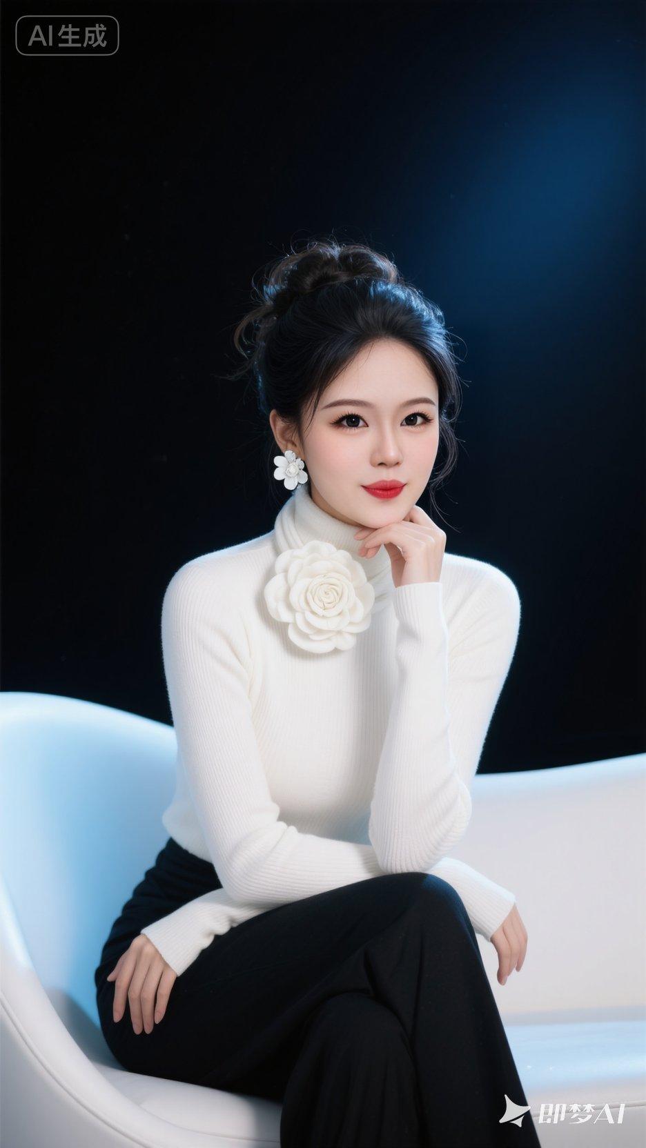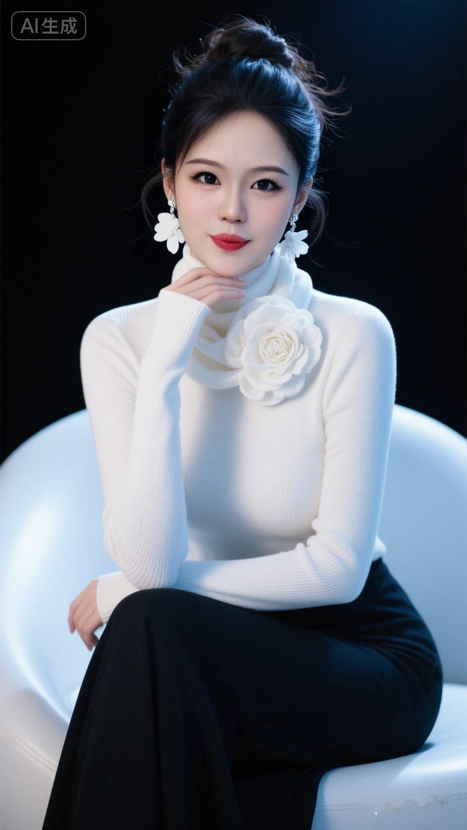 人美,高盘发,微乱,发丝边缘有光,白花耳坠,高清,蓝光,高贵,典雅,绣丽,完美,优雅,高档白色高领毛衫,上围饱满丰腴,脖子上戴花大围巾