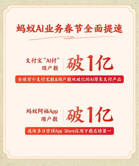 新浪科技讯2月23日上午消息,马年大年初七,蚂蚁集团披露春节假期实战数据,核心AI业务全面爆发:支付宝“AI付”用户数突破1亿,蚂蚁阿福App的总用户数也突破1亿大关。