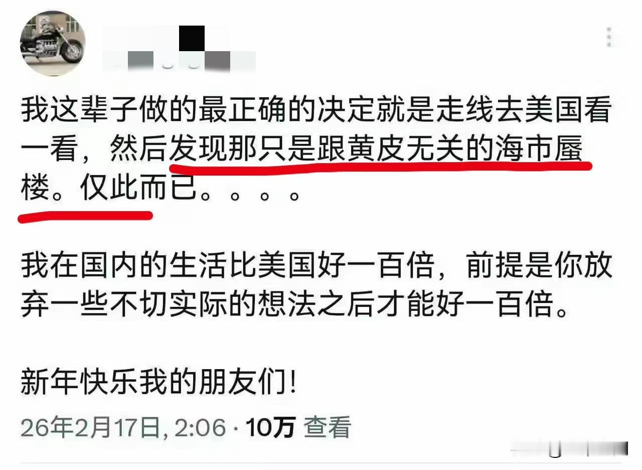 还是美国的教育强大,3年前连美国的沙滩都是民主沙滩,3年后感叹那只是海市蜃楼,承认自己国内的生活比美国好一百倍,但是前提是要放弃那些不切实际的想法之后,才能好一百倍! 其实我们现在最大的缺点,就是什么都做得太好了,太容易养出巨婴了,这些巨婴以它们的能力和水平,根本就不能享有它们今天的生活,它们如果去美国,以它们的能力就是直接掉入斩杀线,变成流浪汉,最后变成高达的,但是国内给它们托底,让它们没有学贷,就可以完全基本教育,然后又一份几千块的工作,结果它们反过来觉得怀才不遇,是大环境让它们无法发挥它们的才能,所以反过来怪大环境不好,它们都觉得以它们的能力,都是可以选总统的,所以它们有些人去了美国,然后被现实教育了,有些连润去美国的能力和毅力都没有,只能在国内社交平台上各种唱反调,各种阴阳怪气!