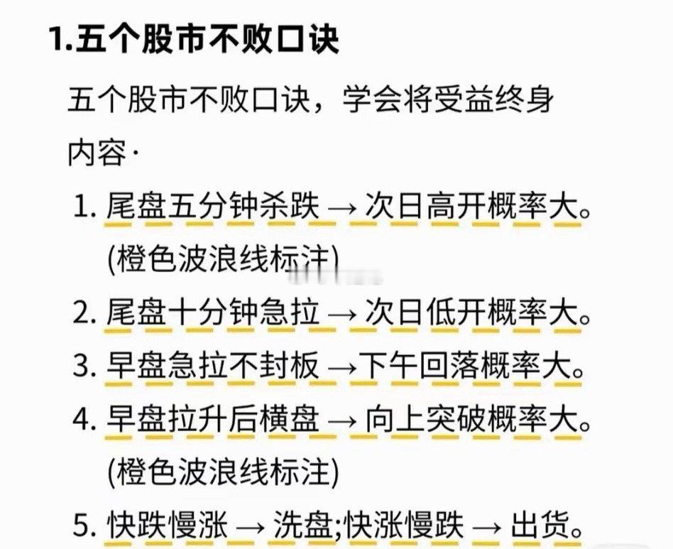 股市经验总结(5大要点):1. 五句不败口诀:尾盘杀跌次日易高开;尾盘急拉次日易低开;早盘急拉不封板午后易回落;早盘拉升横盘易向上突破;快跌慢涨是洗盘,快涨慢跌是出货。