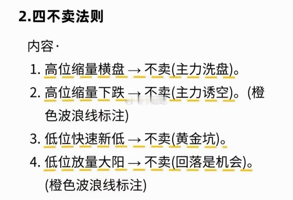 2. 四不卖法则:高位缩量横盘/下跌不卖(洗盘/诱空);低位快速新低/放量大阳不卖(黄金坑/机会)。