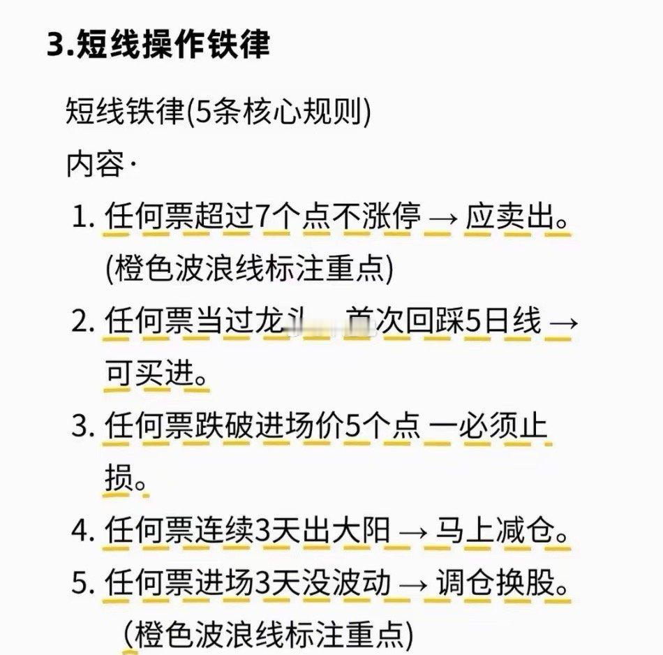 3. 短线铁律:超7点不涨停卖出;龙头首踩5日线买进;跌破成本5点止损;连3天大阳减仓;进场3天无波动换股。