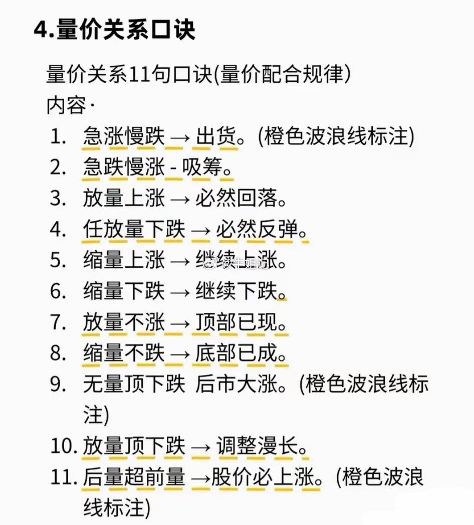 4. 量价口诀:急涨慢跌出货;急跌慢涨吸筹;放量涨必回落;缩量涨续涨;无量顶跌后市大涨;后量超前量必涨等。