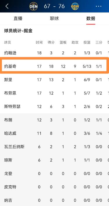 掘金超级巨星约基奇真是无所不能!在今天掘金客场挑战勇士的比赛中,目前双方半场战罢,虽然掘金以67:76落后于对手,但是约基奇却打出了极其全面的表现。 今天的这场NBA常规赛,是掘金客场对阵勇士,两队一开场就展现出了不一样的状态。 勇士那边虽然少了几名核心球员不能上场,但球队整体手感很热,一上来就频频在外围开火,很快就建立起了领先优势。 而掘金这边开局有些慢热,进攻端大多要依靠约基奇来带动,整体的进攻效率不算高,第一节打完,掘金就落后了勇士不少分数。 到了第二节,双方开始了对攻,掘金这边在约基奇的带动下,进攻状态慢慢回暖,队里其他球员也逐渐找到手感,努力追赶比分。 勇士那边则继续保持着外线的火力,多名球员都能得分,始终维持着领先。 半场结束的时候,掘金还是没能追上,依旧落后着勇士,但约基奇的表现,却让所有人都看在眼里。 整个上半场,约基奇几乎承包了掘金的方方面面,不管是进攻、防守,还是串联球队,他都做得很到位。 进攻端,他既能自己出手得分,也能靠着罚球稳稳拿分,偶尔还能在外围投进远投。 防守端,他能牢牢守住内线,抢下不少篮板球,还能及时抢断对手的传球,甚至能给对手的投篮造成干扰,送出盖帽。 更关键的是,约基奇不仅仅只顾着自己得分,还一直在努力串联球队,不停给队友创造出手机会,带动身边的队友一起进攻。 第二节的时候,正是因为他的多次传球,队里其他球员才有了更多轻松得分的机会,也才能慢慢缩小和勇士之间的分差。 看得出来,约基奇在场上非常拼,上半场出场的时间不算短,每一个回合都在认真对待,没有丝毫松懈。 哪怕球队一直处于落后状态,他也没有急躁,依旧按照自己的节奏去打球,攻防两端都保持着稳定的发挥。 虽然目前半场战罢,掘金还落后于勇士,而且这场比赛掘金这边也有几名球员缺席,整体阵容不算完整,但有约基奇这样全面的表现,下半场掘金还是有机会追上比分的。 毕竟,能在落后的情况下,依旧保持如此全面且稳定的发挥,这样的约基奇,确实配得上超级巨星的称号,也让人看到了他无所不能的一面。 以上都是个人观点,对此您有什么不同的看法,可以在评论区留言讨论!!!