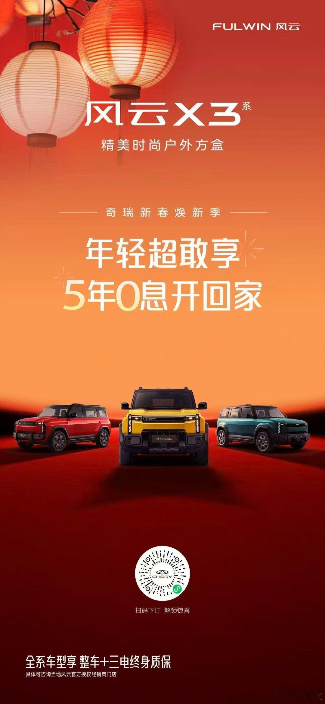 奇瑞汽车新春焕新季,这个活动很给力,0压开新车,5年10万3年免息,月供低至1667元。