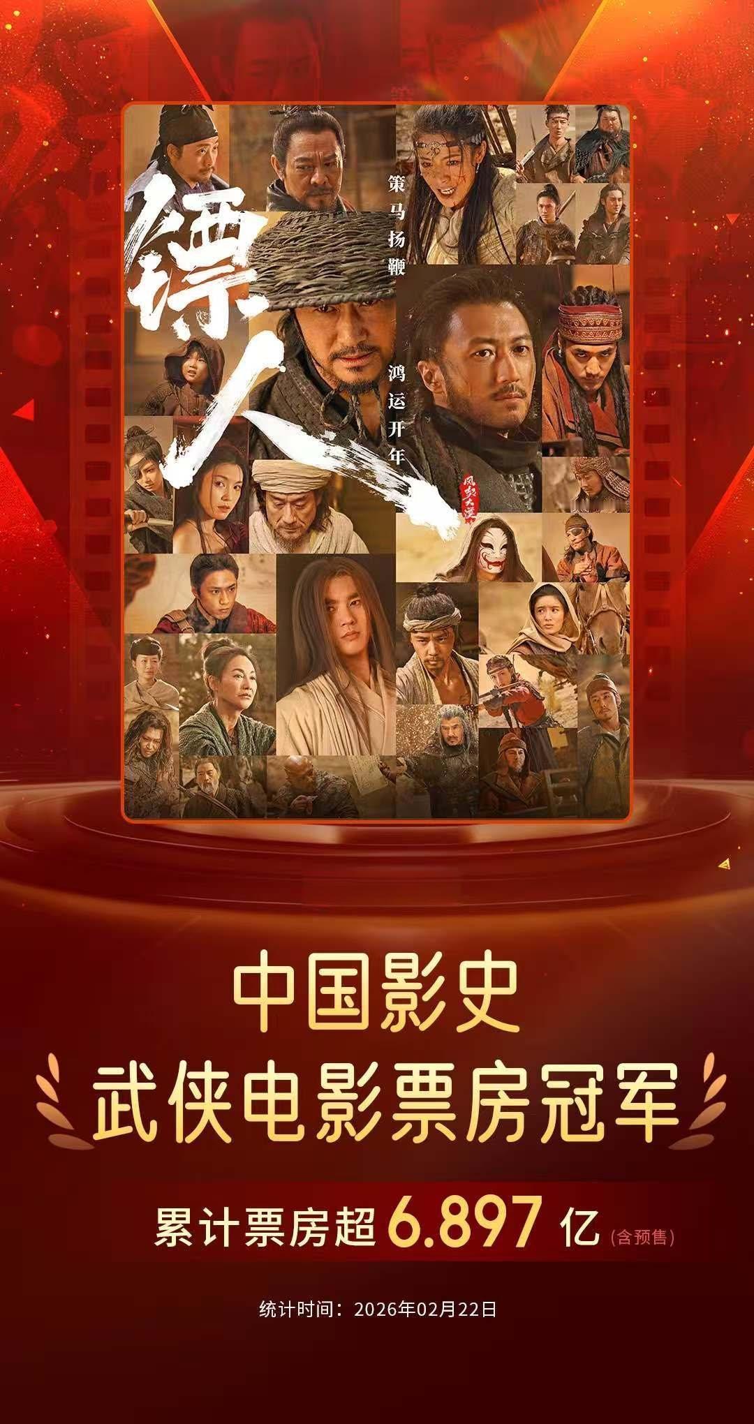 据猫眼专业版数据,截至2月22日,《镖人:风起大漠》票房(含预售)已突破6.897亿,成为中国影史武侠电影票房冠军。