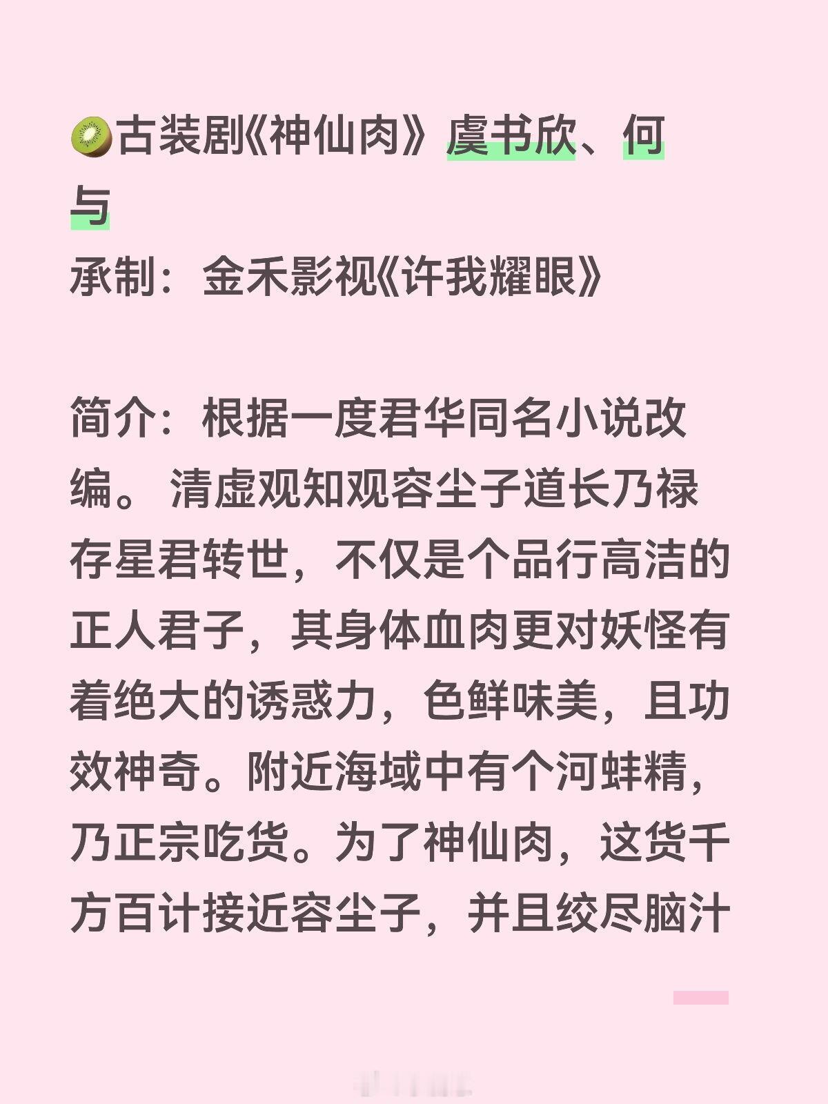 🥝古装剧《神仙肉》网传虞书欣、何与二搭🥝古装剧《神仙肉》虞书欣、何与承制:金禾影视《许我耀眼》简介:根据一度君华同名小说改编。 清虚观知观容尘子道长乃禄存星君转世,不仅是个品行高洁的正人君子,其身体血肉更对妖怪有着绝大的诱惑力,色鲜味美,且功效神奇。附近海域中有个河蚌精,乃正宗吃货。为了神仙肉,这货千方百计接近容尘子,并且绞尽脑汁