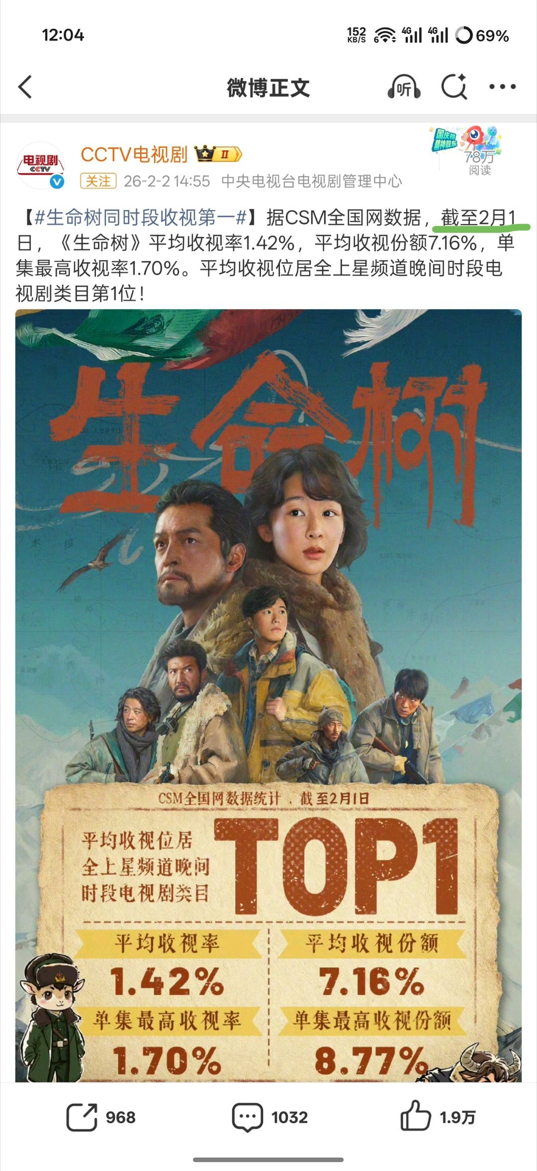 怎么还有官博诈收视率的啊?央八发的首播三天1.42,被《生命树》官方诈成全剧平均