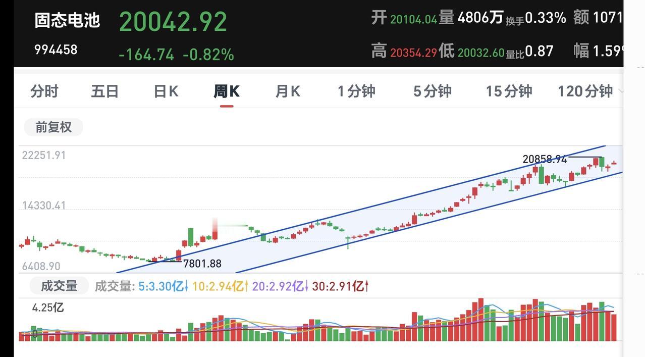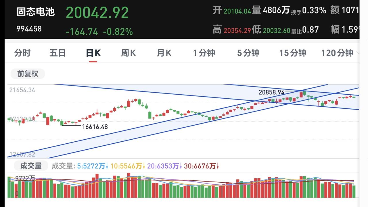 基金:固态电池板块应该怎么办 香港市场今天大涨,恒生指数上涨了2.29%,国企指数上涨了2.50%,恒生科技指数上涨了3.32%,上涨幅度都比较大。 香港市场今天上涨幅度比较大的三个板块是:硅片板块,固态电池板块,黄金板块,下跌幅度比较大的三个板块是:殡葬股板块,数字货币板块,智能建筑板块。 我们的固态电池板块,现在日线级别处于短期下跌通道中,距离这个下跌通道的上轨线比较近,明天观察能不能上涨突破这个短期下跌通道的上轨线,只有突破了这个下跌通道的上轨线,短线才有走强的可能性。 固态电池板块周线级别处于上涨通道中,距离上涨通道的下轨线更近一些,长线持有的人以这个上涨通道的下轨线作为持有条件,只要不跌破这个上涨通道的下轨线,就可以继续持有。 固态电池板块日线级别观察短线能不能由下跌趋势转为上涨趋势,短线的人如果见到突破日线级别下跌通道的上轨线,就可以考虑进场,长线的人继续持有,周线级别上涨通道的下轨线是长线持有者的持有条件。 祝大家新年快乐,祝大家万事如意,祝大家明天迎来开门红。