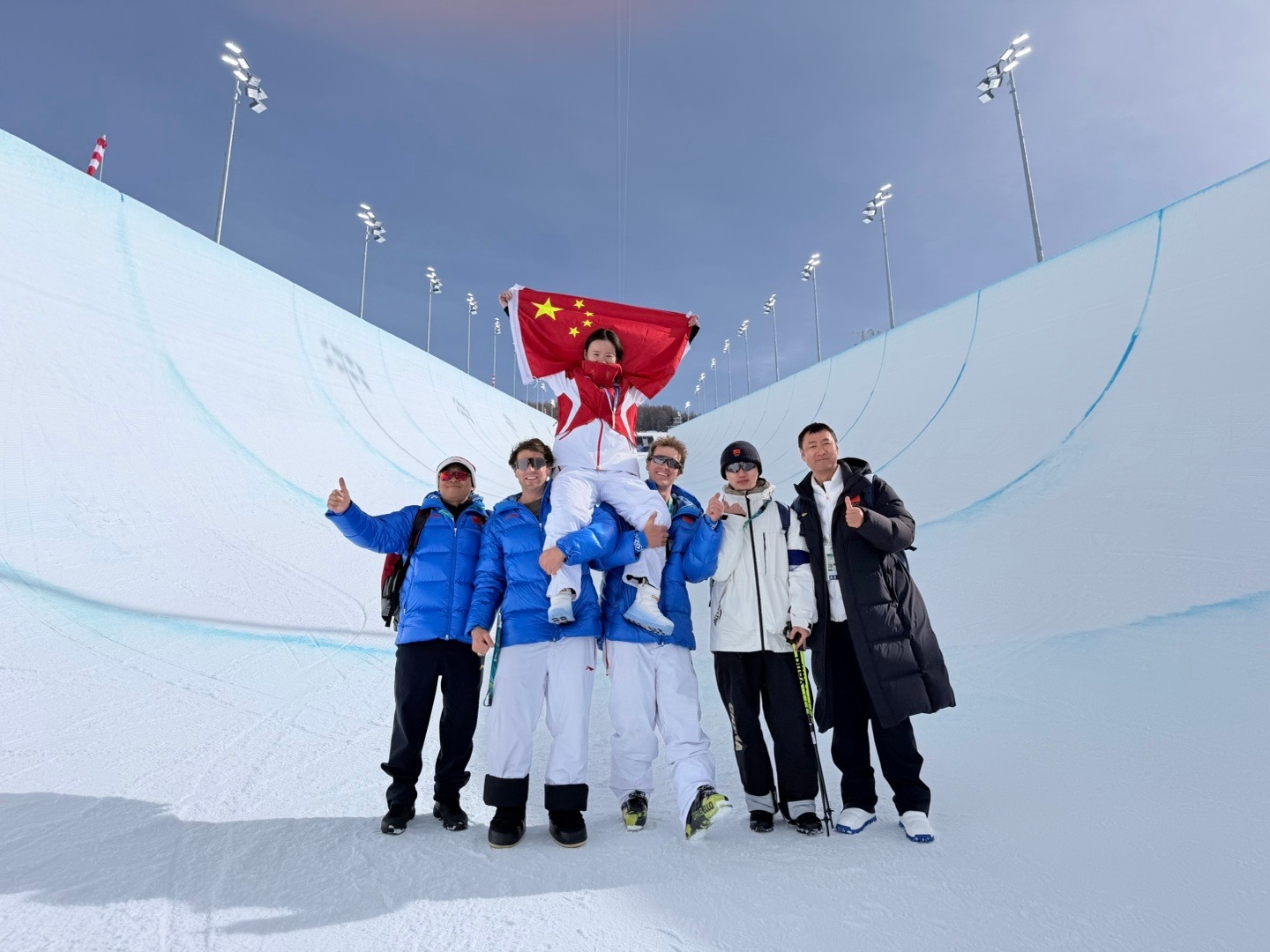 还要感谢背后默默付出的团队——教练、队医、体能师,还有所有工作人员。这些年风里雪里的陪伴,你们比谁都清楚我摔了多少跤、流了多少汗。这枚银牌,有你们一半。