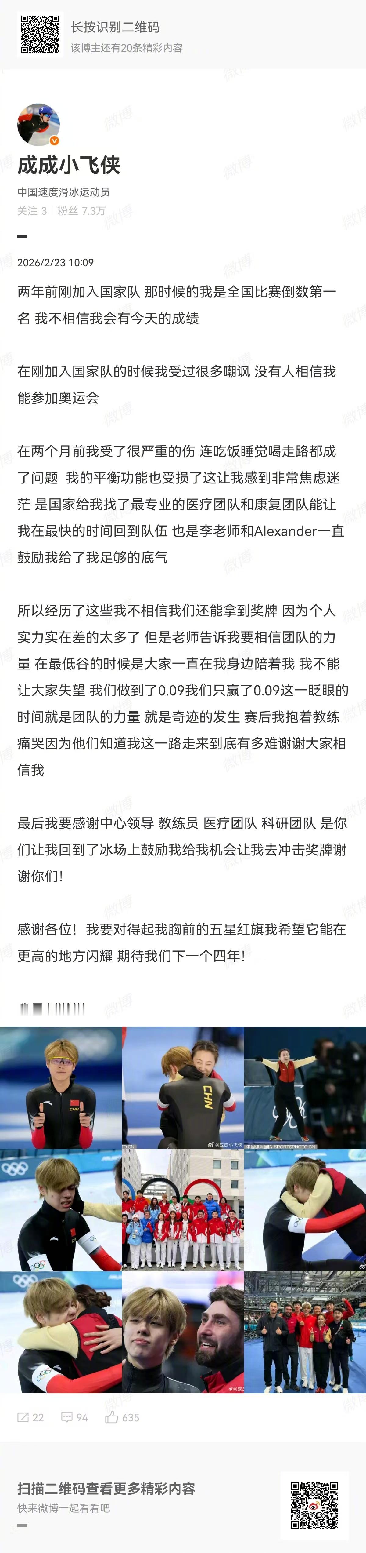刘瀚彬晒多张与李琰拥抱照【刘瀚彬总结冬奥会:团队力量创造0.09 秒奇迹】刘瀚彬从全国倒数到冬奥夺牌 2月23日,米兰冬奥会速度滑冰男子团体追逐铜牌得主刘瀚彬发布长文,深情回顾自己的冬奥征程,并晒出多张与教练李琰的暖心拥抱合照,为此次冬奥之旅画上圆满句号。